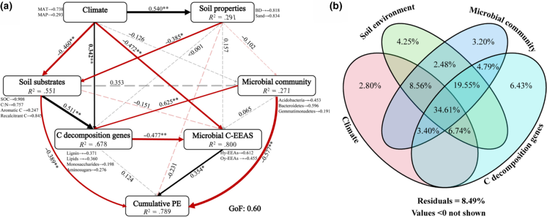 圖1 環(huán)境活力對累積啟動效應 (PE) 的影響 (a) PLS-PM有向圖 (b) VPA分析顯示氣候、土壤環(huán)境、微生物群落和C分解基因對累積啟動效應的相對貢獻