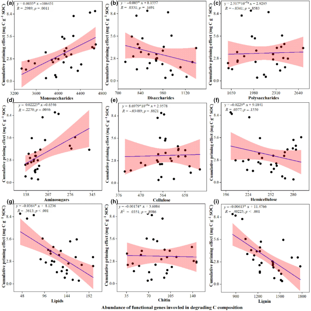 圖2?累積啟動效應與 (a-c)不穩(wěn)定C降解功能基因豐度 (d-i)穩(wěn)定C降解功能基因豐度之間的關系