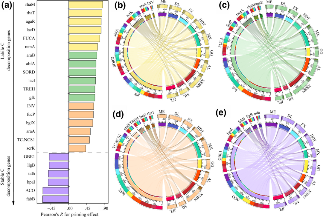 圖3 預測基因在整個森林生物群系中的啟動效應 (a) 所選關鍵基因的變化(由與啟動效應的顯著相關性表示:p?<0 .05),(b-d) 所選基因在森林生物群落中不穩(wěn)定C分解的分布 (e) 用于在森林生物群系中穩(wěn)定C分解的選定基因的分布