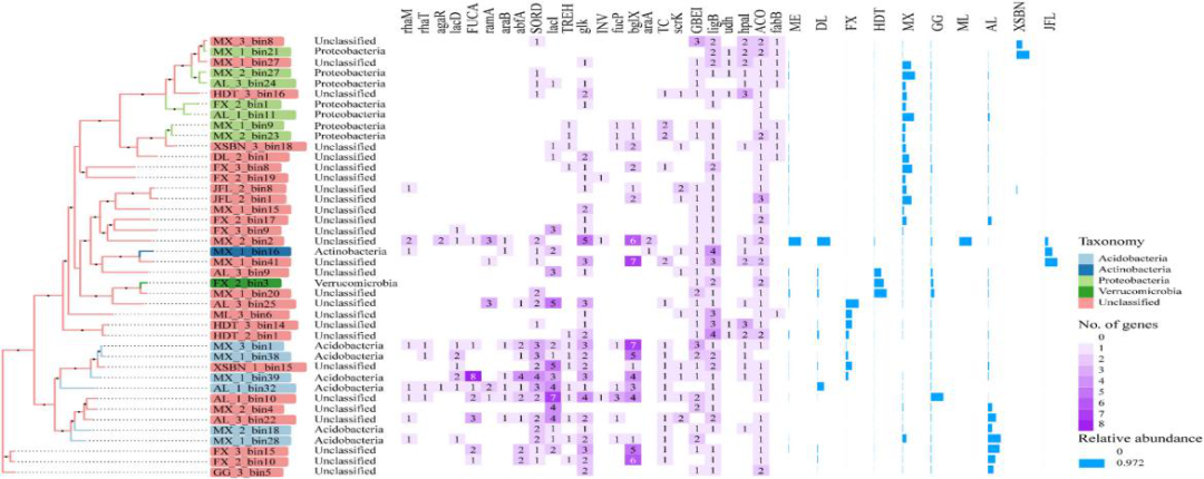 對于分類學,42個MAG在門水平上代表了變形菌門(七個)、酸桿菌門(六個)、放線菌門(一個)和疣微菌門(一個)中的多種細菌門。在變形菌門中,Alphaproteobacteria綱(四個)和Rhizobiales目(兩個)是最豐富的。在酸桿菌中,Solibacteres綱(四個)和?Candidatus Solibacter usitatus?種(四個)代表更多。此外,基于系統(tǒng)發(fā)育關系,來自16S rRNA 系統(tǒng)型的五個未分類bin與相似的分類bin聚類。