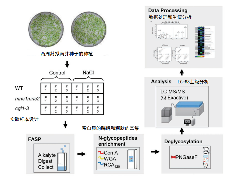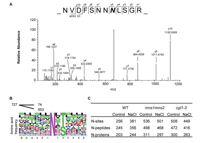 許多證據(jù)表明,植物對鹽脅迫的適應(yīng)性反應(yīng)需要相關(guān)蛋白上加工成熟的N-聚糖參與。然而,關(guān)于在這個過程中起作用的鹽響應(yīng)糖蛋白知之甚少。本研究鑒定了野生型?(WT)擬南芥中的鹽響應(yīng)糖蛋白和兩個N-聚糖成熟缺陷的突變體mns1?mns2和cgl1。通過液相色譜串聯(lián)質(zhì)譜?(LC-MS/MS)?進行定量分析,共鑒定出97種豐度變化?>?1.5?的蛋白質(zhì)對抗鹽脅迫。表明N-聚糖對于調(diào)節(jié)應(yīng)激反應(yīng)蛋白水平至關(guān)重要,并且列出了幾種負責擬南芥耐鹽脅迫的新型糖蛋白。