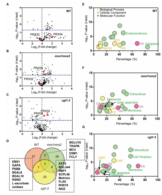 文中進一步分析了鹽脅迫下DAG在GO注釋和KEGG代謝途徑中的生物學功能。在兩個突變體中觀察到更多減少的糖蛋白,尤其是在cgl1-3中(圖2?A–C)。值得注意的是,與?WT?相比,?mns1?mns2和cgl1-3突變體中的水解酶均得到富集(圖2?D–F)。在鹽脅迫下,WT和兩個參與內(nèi)質(zhì)網(wǎng)聚糖鏈轉(zhuǎn)移的突變體中?STT3A(OST亞基)、紫色酸性磷酸酶?2(PAP2)和類胚蛋白10(GLP10)的豐度發(fā)生了變化,這些蛋白分別參與了根系生長和碳代謝(圖2?D)。STT3A在?WT中增加,但在mns1?mns2和cgl1-3中減少;PAP2?在?WT?和mns1mns2中增加,但在cgl1-3中減少,并且GLP10在所有三個樣本中都增加。進一步的分子功能分析發(fā)現(xiàn),與WT相比,水解酶活性在mns1?mns2和cgl1-3中富集(圖2?E,G)。WT中鑒定的蛋白質(zhì)的生物學過程多與應(yīng)激反應(yīng)相關(guān),而來自突變體的大多數(shù)DAG與碳水化合物代謝過程有關(guān)(圖3?G)。這些結(jié)果表明,mns1?mns2和cgl1-3突變體中的鹽響應(yīng)糖蛋白不能正確響應(yīng)壓力,這可能是由于缺乏正確的N-聚糖修飾,導致它們的亞細胞定位異常。