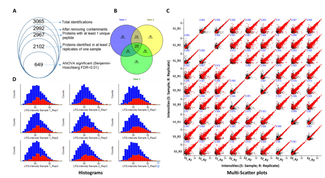 維恩圖分析顯示1702個蛋白質(zhì)組通常在所有三個塊莖樣品中鑒定,而89、36和54個蛋白質(zhì)組分別僅在塊莖?1、2和3中鑒定。此外,塊莖?1?和塊莖?2?共有?112?個蛋白質(zhì)組,表明它們的蛋白質(zhì)組與塊莖對?(2,3)?和?(3,1)?相比更密切相關(guān)(圖1?B)。為了檢查同一樣品一式三份中無標記蛋白質(zhì)定量的重現(xiàn)性,使用?Perseus軟件生成多散點圖(圖1?C)。相同樣本的散點圖顯示出典型的非均勻分布,即在較低強度時較寬,在較高強度時指向較高。同一樣品的不同重復的皮爾遜相關(guān)系數(shù)大于0.944,表明同一樣品的三次重復之間具有高度相關(guān)性。直方圖顯示了缺失值插補前后的蛋白質(zhì)計數(shù)?(圖1?D)。