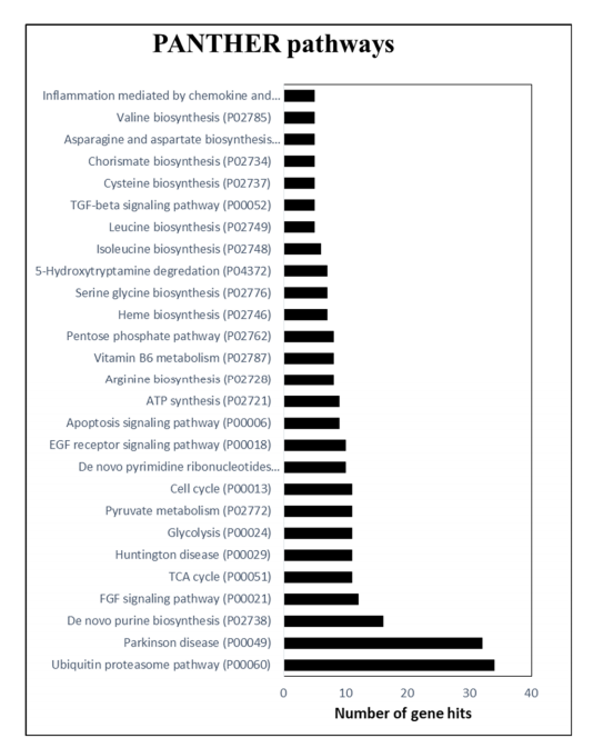統(tǒng)計分析后,作者進行基于基因本體(GO)的功能分類,在2102種蛋白質(zhì)中,PANTHER?19.0?針對Helianthus?annus數(shù)據(jù)庫檢測到2044種蛋白質(zhì)。接下來,進行?PANTHER?通路分析以對蛋白質(zhì)通路進行分類,發(fā)現(xiàn)了大多數(shù)蛋白質(zhì)歸因于泛素蛋白體和核苷酸(嘌呤)生物合成途徑,其次是TCA循環(huán)、糖酵解、丙酮酸代謝、細胞周期和嘧啶核糖核苷酸途徑。