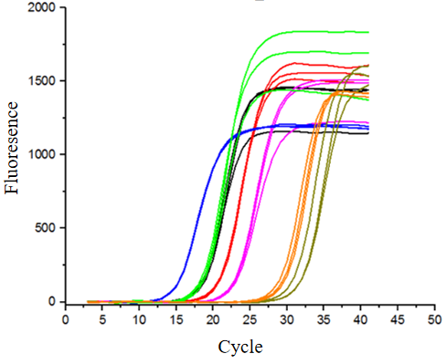 圖3:物種多樣性檢測(cè):分別以不同物種、不同濃度的RNA為模板,進(jìn)行一步法RT-qPCR擴(kuò)增。包括人肝癌(藍(lán)色);果蠅(綠色);小鼠腸道(黑色);番茄果(紅色);日本水稻(紫色);辣椒(橙色);石斑魚(灰色)。