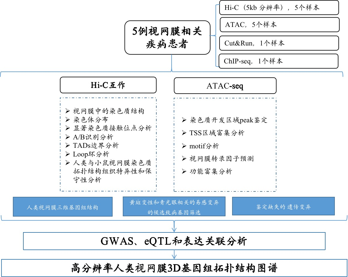 在過去視網(wǎng)膜疾病的全基因組關聯(lián)研究(GWAS)發(fā)現(xiàn)常見的變異主要在基因組非編碼區(qū)域,但由于先導變異區(qū)域的局部連鎖不平衡(LD),阻礙了特定關聯(lián)基因和變異的識別,因此闡明與性狀相關的遺傳變異如何影響調節(jié)基因表達網(wǎng)絡,并因此影響表型,亟需了解相關組織和細胞類型的3D基因組拓撲結構。
