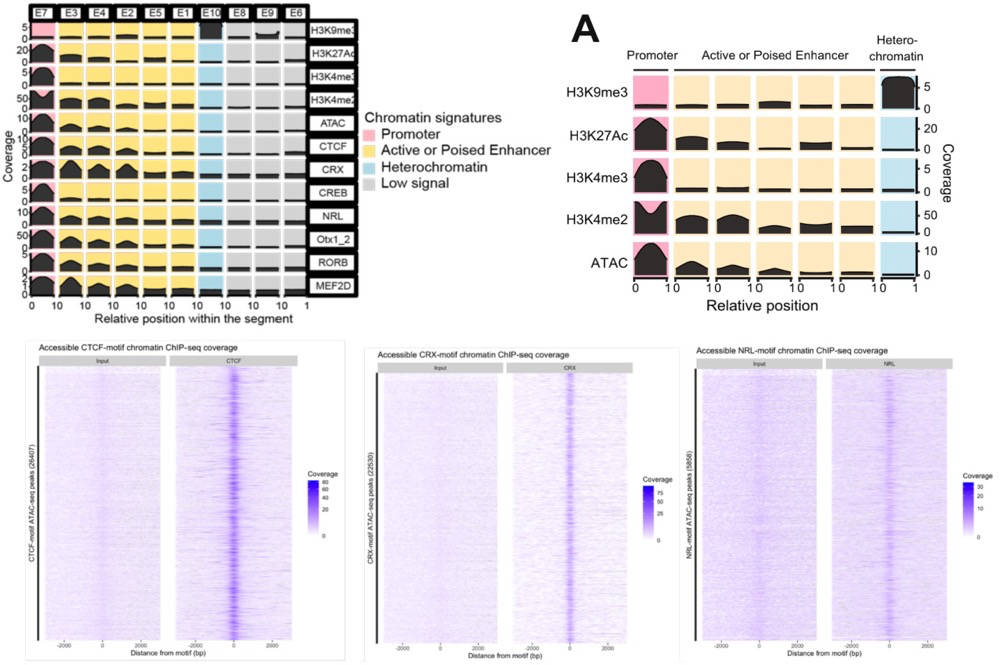 染色質互作形成的loops促進CRE與其目標基因之間的物理相互作用,并且在控制基因表達方面發(fā)揮著至關重要的作用。為了識別視網(wǎng)膜CRE,利用染色質可及性檢測(ATAC-seq)確定了染色質開放狀態(tài)和CUT&Run檢測活性(H3K4me3,H3K27Ac,H3K4me234)和抑制性(H3K9me3)組蛋白標記互作的特征序列。通過全基因組染色質開放程度以及開放區(qū)域(啟動子、增強子、異染色質、低豐度信號)構建了10種染色質狀態(tài)模型,啟動子和增強子區(qū)域富集了用于結合CTCF和關鍵視網(wǎng)膜TF,如CRX、NRL、OTX2、MEF2D、CREB和RORB,另外增強子主要在TSS上游區(qū)域富集,而啟動子僅在TSS富集。