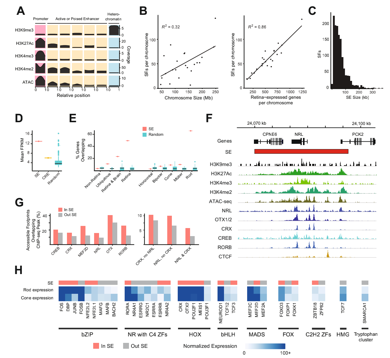 利用H3K27Ac蛋白標記互作在視網(wǎng)膜順式調控元件啟動子和活性或穩(wěn)定增強子區(qū)域鑒定了1325個超級增強子(SEs),發(fā)現(xiàn)視網(wǎng)膜表達基因的數(shù)量與每個染色體的SE數(shù)量之間存在高度相關性。SE與轉錄組測序數(shù)據(jù)集結合分析表明,與CRE相比,SE重疊的基因的平均表達量高2.17倍,并且比100組隨機SE大小的位點高2.89倍,視網(wǎng)膜中關鍵的光感受器特異性基因NRL主要在活性組蛋白標記和染色質開放區(qū)域的大型SE中富集,與CRE或隨機區(qū)域相比,TF結合位點主要存在于SE中,其中編碼許多具有豐富結合基序TF的基因也與SE重疊,這表明它們在維持視網(wǎng)膜穩(wěn)態(tài)方面的潛在作用。