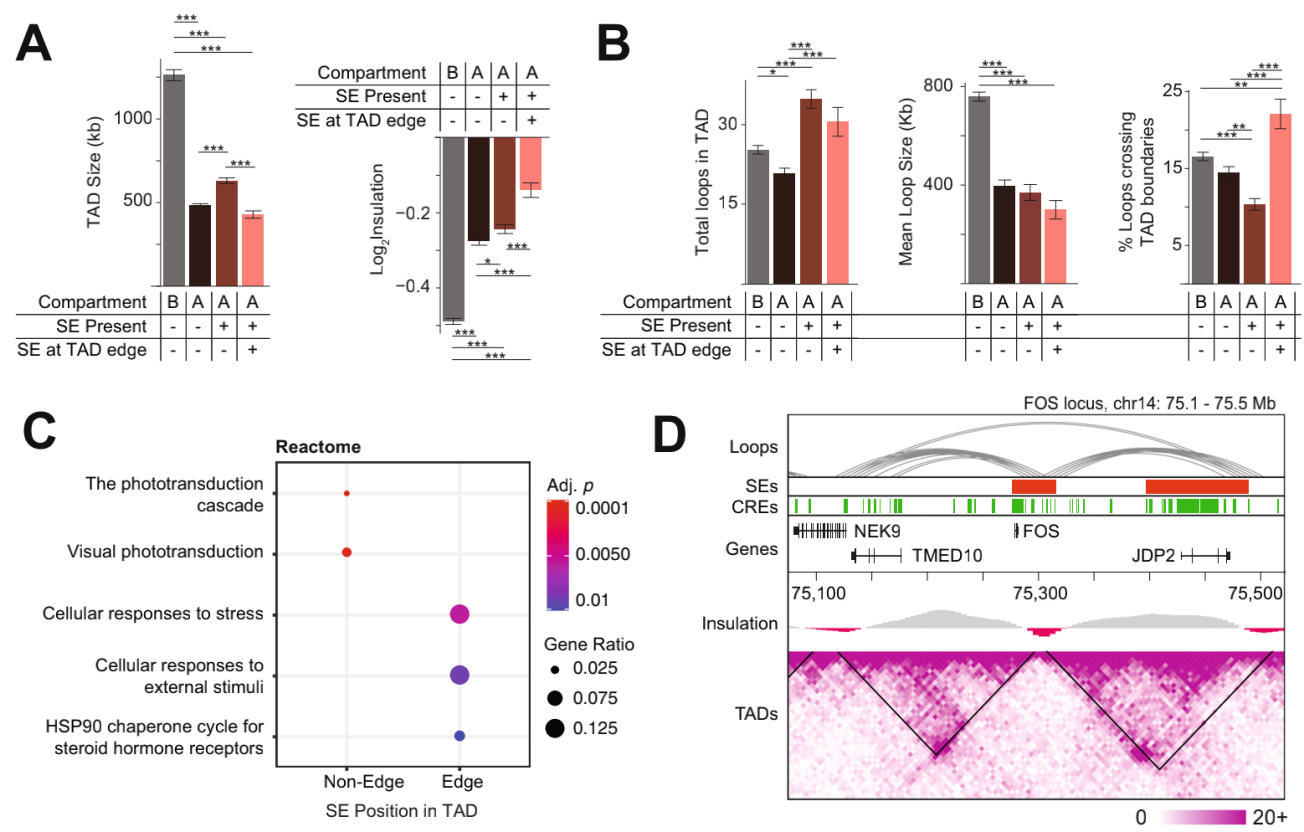 SE靶向基因功能研究,即TSS與SE重疊或相互作用的基因,發(fā)現(xiàn)SE處在邊緣的TAD中都是富含應激反應基因,而視網(wǎng)膜基因主要在SE處于中心的TAD中富集,其中應激反應FOS重疊的SE位于TAD的邊緣,該TAD可能會受到超出自身TAD邊界的區(qū)域變化的影響。