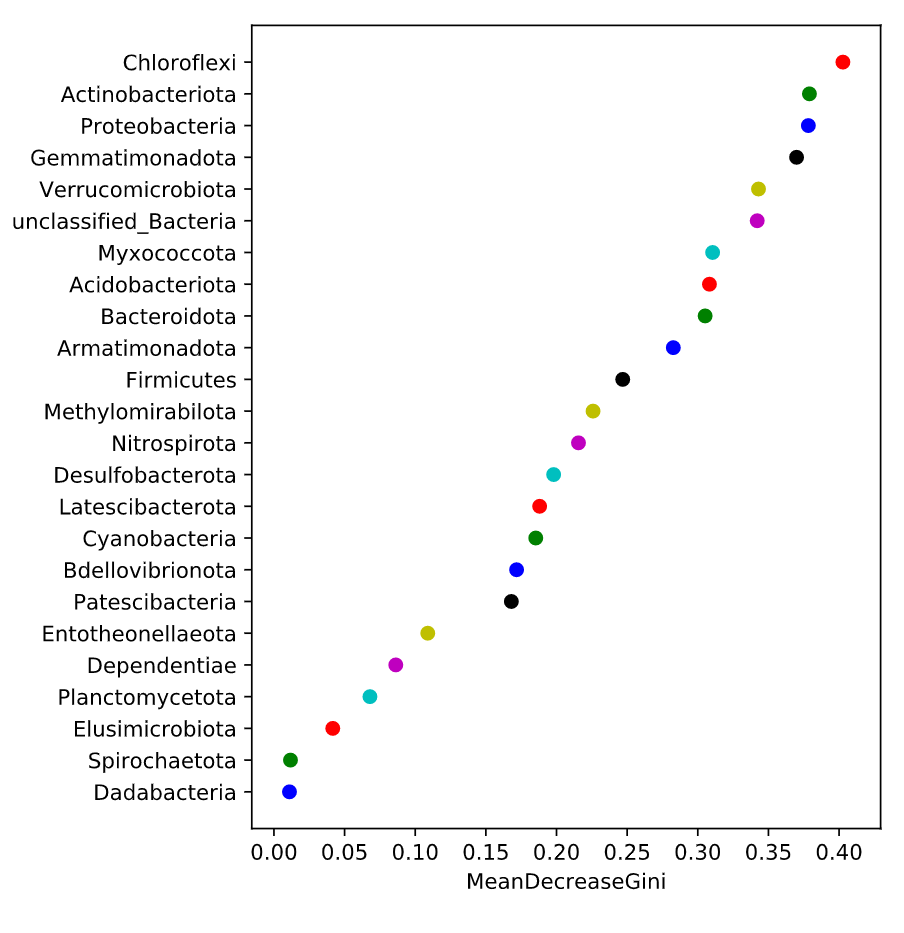 隨機(jī)森林分析:Random forest 分析,隨機(jī)森林指的是利用多棵樹對(duì)樣本進(jìn)行訓(xùn)練并預(yù)測(cè)的一種分類器,是機(jī)器學(xué)習(xí)的一種。利用隨機(jī)森林分析可以幫我們找到數(shù)據(jù)中重要的特征:在微生物組中就是哪些微生物組成可以作為特征進(jìn)行各種預(yù)測(cè);另外,隨機(jī)森林可以利用這些重要特征構(gòu)建模型用于分類預(yù)測(cè)(分類變量)或者回歸預(yù)測(cè)(數(shù)值型變量);隨機(jī)森林分析建議分組內(nèi)樣品至少30個(gè)以上,樣品數(shù)太少影響準(zhǔn)確性。 隨機(jī)森林分析,一般將數(shù)據(jù)劃分為訓(xùn)練數(shù)據(jù)集(train data)和測(cè)試數(shù)據(jù)集(test or validate data),訓(xùn)練數(shù)據(jù)集用于構(gòu)建預(yù)測(cè)模型,測(cè)試集用于查看模型的準(zhǔn)確性。
