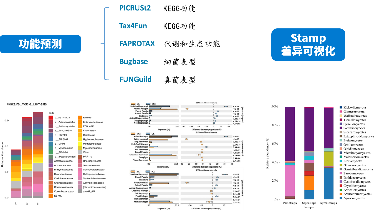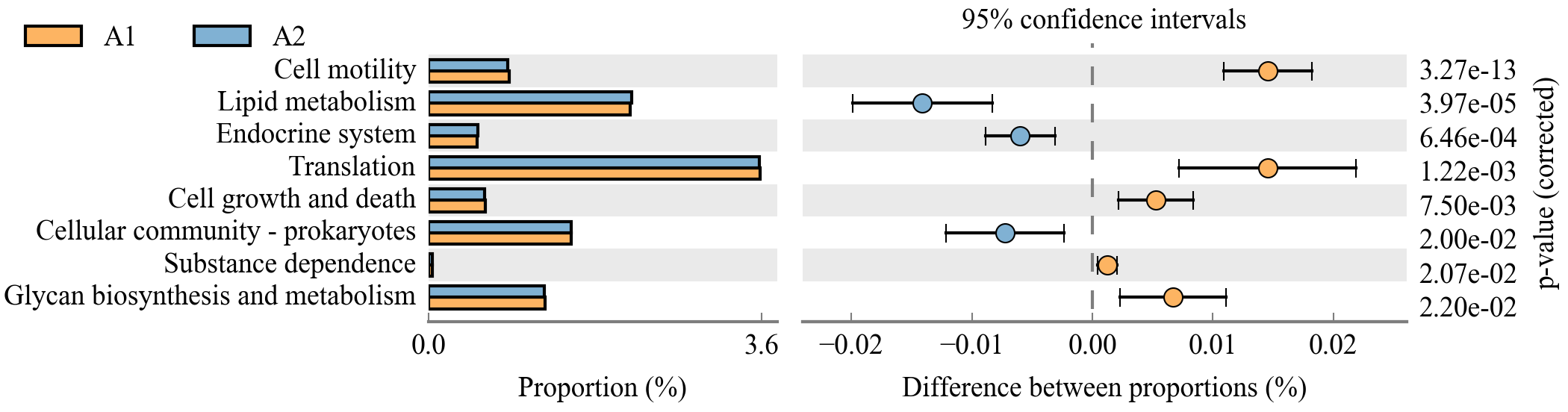 PICRUSt 2 將特征序列(16S rRNA)與微生物基因組數(shù)據(jù)庫(kù)(IMG,Integrated Microbial Genomes)參考序列對(duì)齊(aliign)構(gòu)建進(jìn)化樹,找到特征序列的“最近物種”,并根據(jù)已知物種的基因種類和豐度信息預(yù)測(cè)未知物種的基因信息,從而結(jié)合基因的KEGG通路信息預(yù)測(cè)整個(gè)群落的通路情況。通過(guò)組間差異分析,得到在組間具有顯著差異的功能,最后利用Stamp對(duì)結(jié)果進(jìn)行差異可視化。
