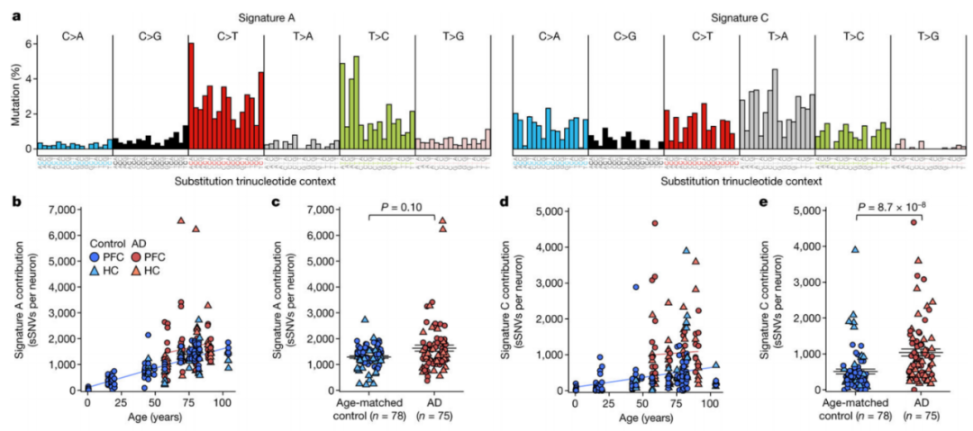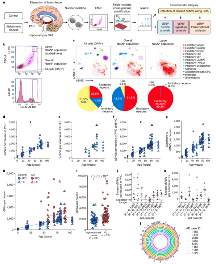 對(duì)從AD和神經(jīng)典型對(duì)照個(gè)體的大腦中分離出來(lái)的神經(jīng)元進(jìn)行了單細(xì)胞全基因組測(cè)序(scWGS),染色了泛神經(jīng)元標(biāo)記NeuN來(lái)標(biāo)記神經(jīng)元,并進(jìn)一步只標(biāo)記了大的NeuN陽(yáng)性核,使用多位移放大(MDA)進(jìn)行全基因組擴(kuò)增,分析了8例AD的91個(gè)神經(jīng)元和18個(gè)神經(jīng)典型對(duì)照組的159個(gè)神經(jīng)元。在神經(jīng)典型個(gè)體中,神經(jīng)元sSNVs隨著年齡的增長(zhǎng)而增加,sSNVs的年增長(zhǎng)率相當(dāng)高,從每年13到55個(gè)sSNV不等,在一些特殊細(xì)胞類型中,分裂突變率更高。沒有神經(jīng)診斷的個(gè)體的海馬CA1神經(jīng)元顯示,隨著年齡的增長(zhǎng),sSNVs呈積累的趨勢(shì),這與神經(jīng)典型對(duì)照個(gè)體前額葉皮層(PFC)神經(jīng)元中看到的sSNV的增加沒有顯著差異。