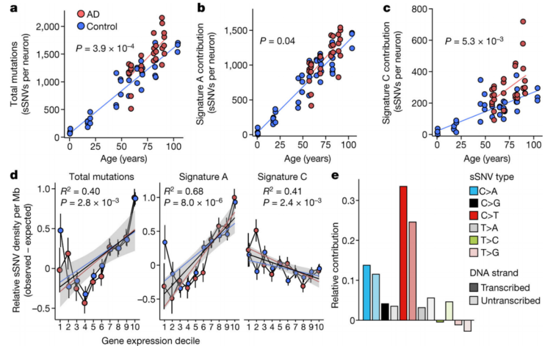 阿爾茨海默氏癥的癡呆癥隨著神經(jīng)變性的進(jìn)展而發(fā)展,但導(dǎo)致神經(jīng)元功能障礙和死亡的具體事件仍然鮮為人知。在正常衰老期間,神經(jīng)元以類似于分裂細(xì)胞的速度逐漸積累軀體突變,這表明遺傳因素、環(huán)境暴露或疾病狀態(tài)可能會(huì)影響這種積累在這里,本文分析了來(lái)自阿爾茨海默病患者和神經(jīng)典型對(duì)照個(gè)體前額葉皮層和海馬體的319個(gè)神經(jīng)元的單細(xì)胞全基因組測(cè)序(scWGS)數(shù)據(jù)。發(fā)現(xiàn)阿爾茨海默氏癥患者的體細(xì)胞DNA改變?cè)黾?,分子模式不同,正常神?jīng)元主要以與年齡相關(guān)的模式(特征A)積累突變,這與之前在健康和癌細(xì)胞中描述的“時(shí)鐘狀”突變特征非常相似。神經(jīng)變性中DNA改變的異常積累為阿爾茨海默病發(fā)展過程中發(fā)生的分子和細(xì)胞事件的級(jí)聯(lián)提供了見解。