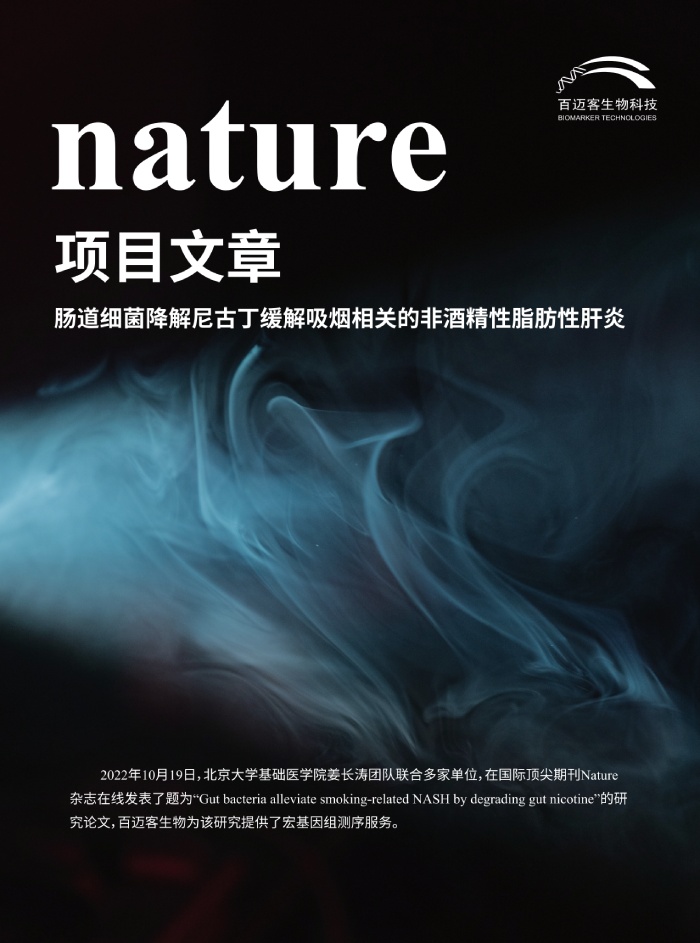 2022年10月19日,北京大學(xué)醫(yī)學(xué)部姜長(zhǎng)濤團(tuán)隊(duì)聯(lián)合美國(guó)國(guó)立衛(wèi)生研究院、浙江大學(xué)醫(yī)學(xué)院、復(fù)旦大學(xué)基礎(chǔ)醫(yī)學(xué)院和溫州醫(yī)科大學(xué)的研究團(tuán)隊(duì)在國(guó)際期刊《Nature》發(fā)表了題為“Gut bacteria alleviate smoking-related NASH by degrading gut nicotine”的重磅研究。該研究解析了腸道尼古丁積累在非酒精性脂肪性肝炎進(jìn)展中的作用,發(fā)現(xiàn)了人類(lèi)腸道中一種能夠代謝尼古丁的內(nèi)源性細(xì)菌,并提出了一種可能的減少吸煙加劇NAFLD進(jìn)展的途徑。百邁客為該研究提供了宏基因組測(cè)序服務(wù)。點(diǎn)擊了解詳情:Nature-宏基因組聯(lián)合多組學(xué)研究揭示腸道有益菌對(duì)非酒精性脂肪性肝炎的保護(hù)作用