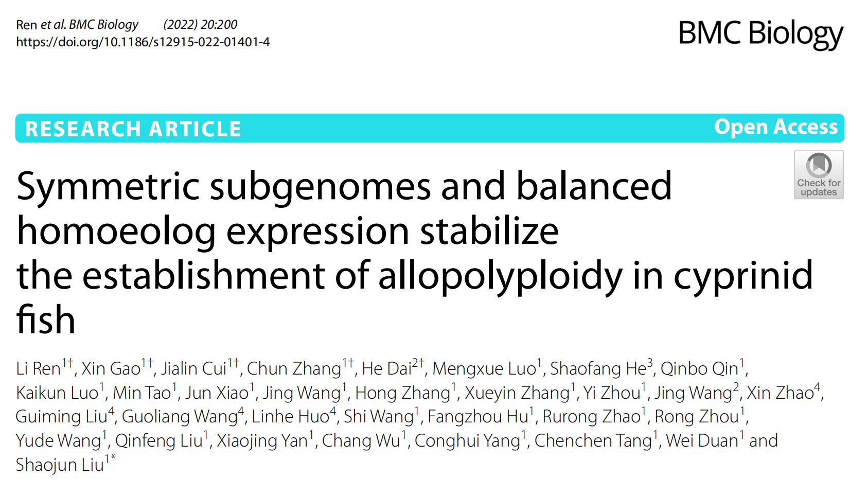 研究內(nèi)容:構(gòu)建了高質(zhì)量的異源四倍體鯽鯉F22代基因組(2.95Gb)。與親本紅鯽和鯉比較,發(fā)現(xiàn)異源四倍體個體中200條染色體一半來自于紅鯽一半來自于鯉,同源染色體間存在重組交換現(xiàn)象。推測DNA修復(fù)和減數(shù)分裂重組等機(jī)制在異源四倍體鯽鯉品系形成過程中共同發(fā)揮作用。交個體中紅鯽和鯉來源基因在表達(dá)和DNA甲基化層面存在多種變化特征。本研究為后續(xù)進(jìn)一步揭示通過遠(yuǎn)緣雜交形成的其它可育品系的遺傳特性提供了重要的參考。