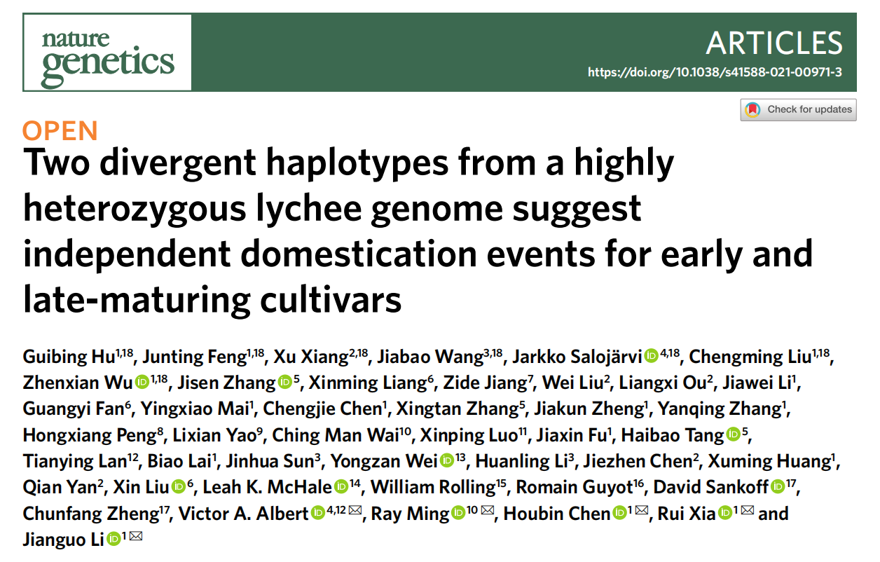 研究內(nèi)容:基于荔枝(Litchi chinensis)基因組的高度雜合(~2.27%),構(gòu)建了兩套高質(zhì)量“妃子笑”單倍型基因組(470 Mb)。72份荔枝重測序分析發(fā)現(xiàn),來自云南的一個野生群體的極早熟荔枝品種主要與“妃子笑”的其中一個單倍型對應(yīng);來自海南的一個野生群體的晚熟荔枝品種則與另外一個單倍型對應(yīng)。早熟荔枝品種可能是極早熟荔枝品種與晚熟荔枝品種的雜交形成的,在廣東培育而成。包含一對CO-like基因的3.7kb序列的缺失變異可能調(diào)控著不同荔枝品種間的果實成熟差異。