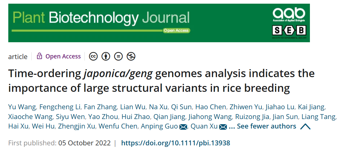 研究內(nèi)容:基于Nanopore平臺構(gòu)建了12個高質(zhì)量水稻基因組(contigN50 8.77-15.84Mb)。通過全基因組比對分析找尋大量的結(jié)構(gòu)變異(SVs),發(fā)現(xiàn)SV相關(guān)基因可能在葉綠體膜系統(tǒng)中發(fā)揮重要作用,顯性LTG1的水稻品種比具有其他類型等位基因的水稻品種更耐低溫,說明LTG1在調(diào)節(jié)水稻耐寒性中起著關(guān)鍵作用。豐富的基因CNVs是水稻遺傳多樣性的一個重要特征,研究發(fā)現(xiàn)GNP1的拷貝數(shù)變異(CNVs)可能與水稻粒數(shù)相關(guān)。本研究為擴(kuò)寬粳型栽培稻的遺傳多樣性、進(jìn)一步提升育種潛力提供遺傳基礎(chǔ)。