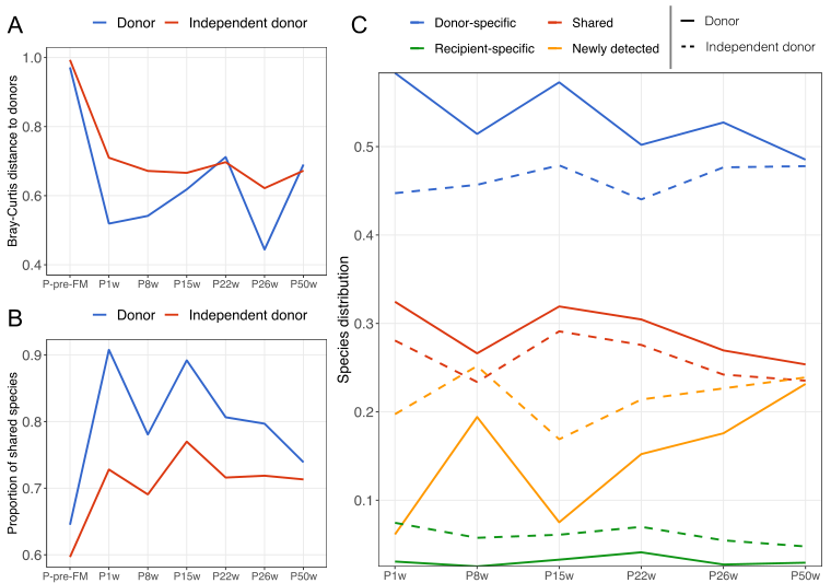 研究者進(jìn)一步將患者 FMT 后腸道微生物群分為四類,即共有的、供體特異性的、受體特異性的和新檢測到的(圖2C)。結(jié)果表明,供體特定物種的百分比高,在第 1 周占 58.3%,并且在研究期間大致保持穩(wěn)定。相比之下,當(dāng)在這些分析中使用獨(dú)立供體代替實(shí)際供體時(shí),供體特定和共享物種的比例在所有采樣時(shí)間點(diǎn)都較低。此外,在 FMT 后跟蹤了轉(zhuǎn)移的供體特異性物種,發(fā)現(xiàn)其中超過 80% 的物種可以成功轉(zhuǎn)移并維持到 50 周,遠(yuǎn)高于獨(dú)立捐贈者。由于供體特異性物種的轉(zhuǎn)移,根據(jù) BrayCurtis 相異性,F(xiàn)MT 后患者的腸道菌群組成與基線時(shí)(P-FMT 前)不同。盡管供體特異性物種在數(shù)量上所占比例大,但它們的豐度很低,并且主要來自擬桿菌科、毛螺菌科、梭菌科和瘤胃球菌科。因?yàn)樨S度高的物種同時(shí)存在于供體和 preFMT 樣本中,無法檢測到細(xì)菌在物種水平上的轉(zhuǎn)移;因此,有必要對微生物轉(zhuǎn)移進(jìn)行更深入的研究。