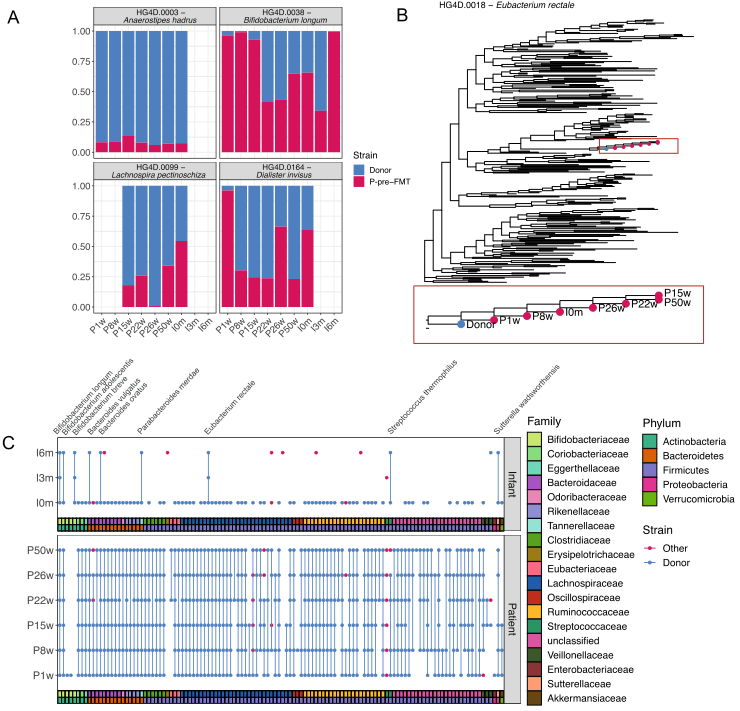 當(dāng)觀察相同等位基因的百分比時(shí),鑒定出120個不同物種的菌株轉(zhuǎn)移,這接近捐贈者樣本中檢測到的所有物種(241個)的一半。在這120種細(xì)菌中,有116種在一個或多個患者樣本中也被檢測到,其中99%(115/116種)從供者向患者轉(zhuǎn)移了菌株(圖3C)。此外,我們在一個或多個患者樣本中觀察到14個物種的替代菌株。在嬰兒樣本中,檢測到87個不同的物種,并在其中92%(80個物種)發(fā)現(xiàn)了供體菌株植入。然而,在這80種細(xì)菌中,87.5%(70種)只在胎糞樣本中發(fā)現(xiàn),在嬰兒以后的時(shí)間點(diǎn)在腸道中檢測到的供體菌株要少得多(3月樣本中3.8%[3/80],6月嬰兒樣本中12.5%[10/80])。有趣的是,當(dāng)同一物種的菌株在治療后在母親體內(nèi)共存時(shí),兩種菌株也會轉(zhuǎn)移給嬰兒。