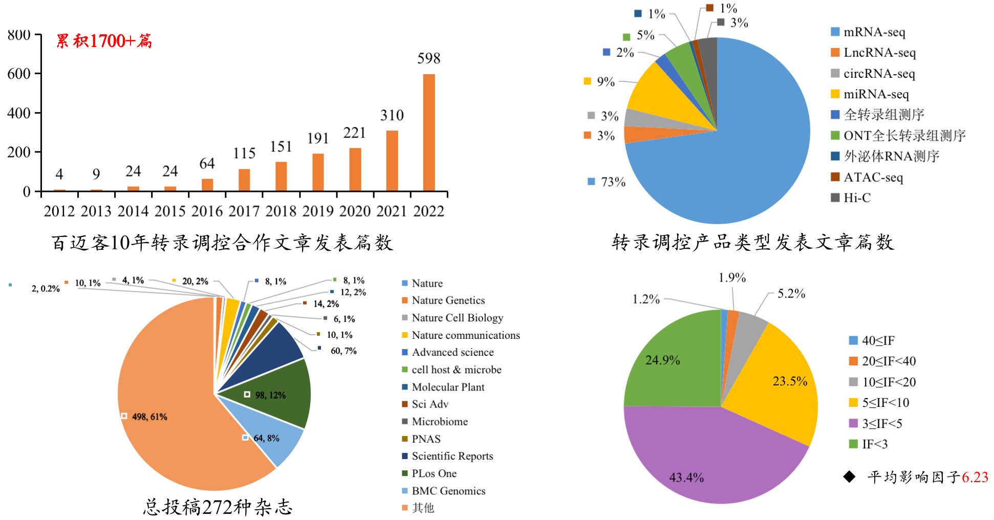 百邁客轉(zhuǎn)錄調(diào)控合作項(xiàng)目文章持續(xù)爆發(fā)增長(zhǎng),累積1700篇,2022年度收錄598篇,總IF高達(dá)3500+,平均影響因子6.23。