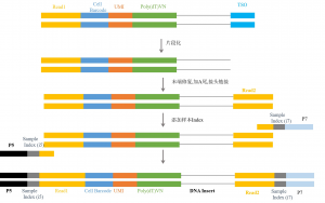 接下來進入單細胞測序的第三環(huán)節(jié)–文庫構建。文庫構建可分為三個部分:DNA片段化/末端修復/添加A尾、接頭連接和Index PCR(PCR富集)。