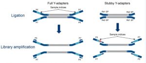 隨后對修復后的片段進行接頭連接,主要是利用DNA連接酶,將3’端帶有dA的DNA片段與adapter接頭進行連接。接頭的分類有兩種方式: