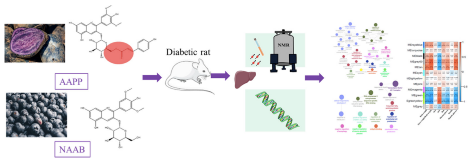 花色苷是植物中的一大類多酚化合物,目前已知是對氧化應(yīng)激、炎癥和能量穩(wěn)態(tài)有調(diào)節(jié)作用。已有報道發(fā)現(xiàn)花色苷具有抗糖尿病的療效?;ㄉ盏暮诵慕Y(jié)構(gòu)是花青苷,它可以糖基化形成非酰化的花青苷,糖苷可以?;笮纬甚;幕ㄇ嘬?。且最近有研究表明,與未?;幕ㄇ嘬障啾龋;ㄇ嘬站哂懈玫姆€(wěn)定性和抗氧化活性。本研究利用全長轉(zhuǎn)錄組學(xué)和核磁共振代謝組學(xué)方法,比較了非?;王;ㄉ諏μ悄虿〈笫蟾闻K基因表達(dá)和代謝的影響。這是第一次綜合應(yīng)用這兩種強(qiáng)大的技術(shù)來研究肝臟基因表達(dá)和代謝產(chǎn)物的變化。