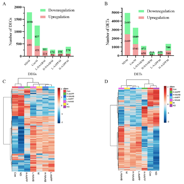 圖1 DEGs(AC)及DETs(BD)的統(tǒng)計分析