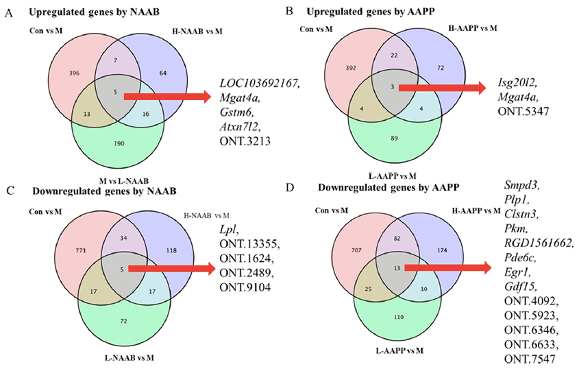 韋恩圖表明了不同分組之間上調(diào)和下調(diào)的DEG的交集,揭示了受NAAB和AAPP影響的特定基因(圖2A?D)。Gstm6與谷胱甘肽代謝、藥物代謝以及細(xì)胞色素P450對外源物質(zhì)的代謝有關(guān),在胰島素抵抗和糖尿病小鼠中均被報道下調(diào),并可能參與T2D的進(jìn)展。L-NAAB和H-NAAB均能恢復(fù)Gstm6的表達(dá)。與ND組和Con組相比,M組中有一個共同的基因被兩種花色苷提取物(NAAB和AAPP)上調(diào),即編碼N-乙酰氨基葡萄糖轉(zhuǎn)移酶GnT-4a的Mgat4a。在小鼠中,Mgat4a基因的遺傳失活導(dǎo)致葡萄糖轉(zhuǎn)運蛋白2N-聚糖的錯誤組裝,導(dǎo)致葡萄糖轉(zhuǎn)運蛋白2和質(zhì)膜凝集素Galectin 9之間的相互作用失敗,導(dǎo)致葡萄糖轉(zhuǎn)運蛋白2內(nèi)化,從而抑制葡萄糖攝取和葡萄糖刺激的胰島素分泌。還發(fā)現(xiàn)高脂飲食抑制了Mgat4a的表達(dá)。藍(lán)莓的非?;ㄉ蘸妥仙R鈴薯的酰化花青苷都是如此。編碼脂蛋白脂肪酶的LPL在小鼠肝臟中過表達(dá),導(dǎo)致肝臟甘油三酯含量增加2倍,并導(dǎo)致胰島素抵抗,部分原因是對胰島素的反應(yīng)受損,抑制內(nèi)源性葡萄糖的產(chǎn)生。在本研究中,L-NAAB和H-NAAB都下調(diào)了ZDF大鼠高水平的LPL,這可能導(dǎo)致胰島素敏感性的改善。早期生長反應(yīng)基因-1(Egr1)可被胰高血糖素短暫激活,介導(dǎo)胰高血糖素調(diào)節(jié)的糖異生。AAPP降低Egr1,這可能與糖異生減少有關(guān)。