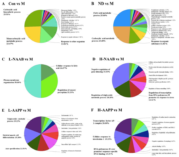 對不同分組中的DEGs進(jìn)行ClueGO分析,以生成按功能分組的注釋網(wǎng)絡(luò)圖(圖4A?F)。在CON/M差異分組的結(jié)果中,DEGs主要富集在羧酸生物合成過程、單羧酸代謝過程和對其他有機(jī)物的反應(yīng)過程。在ND/M分組差異結(jié)果中,脂肪酸代謝過程、羧酸代謝過程和對有機(jī)物的反應(yīng)過程是富集排名前3的功能分組。在ND/M和CON/M分組中,DEGs主要在單羧酸代謝過程、羧酸生物合成過程、脂肪酸代謝過程、脂肪代謝過程和對有機(jī)物的反應(yīng)過程相關(guān)的通路中富集。在L-NAAB/M分組差異結(jié)果中,DEGs組要與三個功能通過有關(guān):質(zhì)膜組織、感覺調(diào)節(jié)和細(xì)胞對脂肪酸的反應(yīng)。在H-NAAB/M差異結(jié)果中,DEGs主要富集于基因沉默的負(fù)調(diào)控、甘油三酯代謝過程的調(diào)控以及RNA聚合酶II啟動子對脅迫反應(yīng)的轉(zhuǎn)錄調(diào)控。在L-AAPP/M比較中,DEGs在甘油三酯分解代謝過程、骨骼肌細(xì)胞分化和軸規(guī)范方面都明顯富集。在H-AAPP/M差異結(jié)果中,發(fā)現(xiàn)轉(zhuǎn)錄因子AP-1復(fù)合體、細(xì)胞對白細(xì)胞介素-1的反應(yīng)以及RNA聚合酶II核心啟動子序列特異性DNA結(jié)合等通路顯著富集。