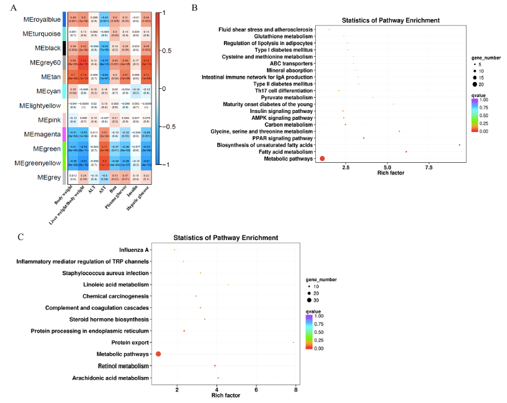 使用DEGs進(jìn)行WGCNA分析以確定共表達(dá)模塊及其與臨床特征的相關(guān)性。確定了12個共表達(dá)模塊,并與以前報道的各種臨床特征(體重、AST、ALT、血尿素氮、血糖和胰島素)相關(guān)(圖7A)。MEgery 60和MEtan模塊與體重、肝重/體重比、血糖、肝糖呈正相關(guān),與天冬氨酸轉(zhuǎn)氨酶呈負(fù)相關(guān)。MEgreen和MEgreenyellow模塊與體重、肝重/體重比、血糖、肝糖呈負(fù)相關(guān),與AST值呈正相關(guān)。接下來,對MEgrey60和MEtan模塊以及MEgreen和MEgreenyellow模塊中的基因進(jìn)行了KEGG通路富集分析。結(jié)果發(fā)現(xiàn)MEgrey60和MEtan中的基因富集的通路主要涉及脂類代謝(脂肪酸代謝、不飽和脂肪酸的生物合成、脂肪細(xì)胞脂解的調(diào)節(jié))、氨基酸代謝(甘氨酸、絲氨酸和蘇氨酸代謝、半胱氨酸和蛋氨酸代謝、谷胱甘肽代謝)、糖尿病(青少年成熟期糖尿病、II型糖尿病、I型糖尿病、胰島素信號通路)(圖7B)。MEgreen和MEgreenyellow模塊中的基因主要富集在花生四烯酸代謝、視黃醇代謝、代謝途徑、蛋白質(zhì)輸出、內(nèi)質(zhì)網(wǎng)蛋白質(zhì)加工、類固醇激素生物合成、補(bǔ)體和凝血級聯(lián)、亞油酸代謝以及TRP通道的炎癥介質(zhì)調(diào)節(jié)(圖7C)。