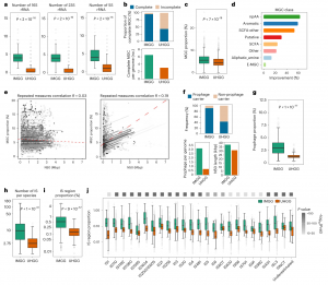 與UHGG數(shù)據(jù)庫(kù)相比,IMGG數(shù)據(jù)庫(kù)中前噬菌體基因組的分辨率有了很大提升。該方法在95%的IMGG中都能檢測(cè)到前噬菌體序列(與UHGG(55%)相比)。IMGG和UHGG每個(gè)基因組編碼前噬菌體的平均數(shù)量分別為4個(gè)和1個(gè)。IMGG中的前噬菌體序列的連續(xù)性也較高,N50長(zhǎng)度為37974 bp(UHGG中為31064 bp;圖3f);IMGG中前噬菌體編碼區(qū)的基因組比例是UHGG的4.2倍(圖3g)。與UHGG相比,IMGG中的IS區(qū)域更加jing q,表現(xiàn)在在每個(gè)物種的IS區(qū)域總拷貝數(shù)(增加了三倍;圖3h)和IS編碼區(qū)域的基因組比例(增加了近四倍;圖3i)。IS類(lèi)別中改善程度*高的是IS1380(與UHGG相比,改善了5.6倍),其次是IS5、IS1634和ISAS1(分別是5.5倍、5.5倍和5.3倍;圖3j)。