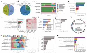 接下來(lái),對(duì)IMGG數(shù)據(jù)庫(kù)中的前噬菌體基因組進(jìn)行深入分析,以探究其功能能力。從12834個(gè)物種水平的vOTU代表性基因組中鑒定出596193個(gè)蛋白質(zhì)編碼基因,并將這些假定基因與幾個(gè)常見(jiàn)的功能和/或病毒注釋數(shù)據(jù)庫(kù)進(jìn)行了比較。結(jié)果表明,僅有55.4%的前噬菌體基因在功能上能夠被分類(lèi),而44.6%的基因與任何交叉比較的數(shù)據(jù)庫(kù)都不具有同源性,被分配給了未知的功能(圖5d)。這些結(jié)果表明,盡管攜帶ARG的噬菌體很少存在于腸道微生物中,但這些噬菌體可能編碼ARG(例如,A163.CMAG_1_1_7_59800編碼假定的β-內(nèi)酰胺酶基因;圖5h),可能成為ARG轉(zhuǎn)移的關(guān)鍵載體,并對(duì)人類(lèi)健康造成嚴(yán)重威脅。這些結(jié)果表明,腸道前噬菌體在分類(lèi)和功能上比先前我們所了解的更加多樣化。