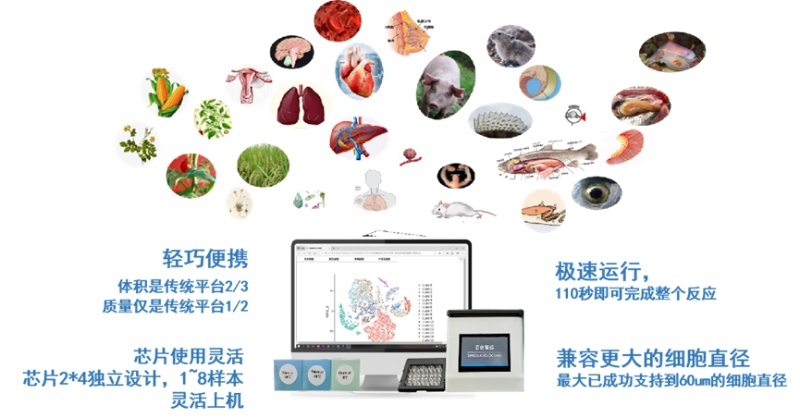 目前百創(chuàng)智造自主研發(fā)的單細(xì)胞微液滴系統(tǒng)-BMKMANU DG1000,是基于微流控、油滴包裹和Barcode標(biāo)記等技術(shù)來實(shí)現(xiàn)高通量的細(xì)胞捕獲,除了110s快速形成油包水(GEMs)結(jié)構(gòu)外,還有配套的2×4的獨(dú)立芯片及配套試劑盒,能兼容60μm的細(xì)胞直徑。目前BMKMANU DG1000已經(jīng)在上百例動(dòng)植物樣本中得到實(shí)測(cè)效果驗(yàn)證。