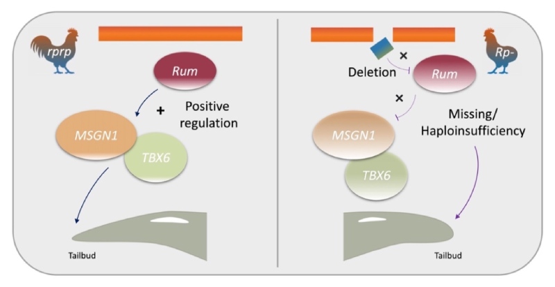 通過對包含家系內(nèi)特殊基因型個體的突變位點進(jìn)行綜合篩選和分析后,一個4.2 kb的缺失被確定與瓢雞的無尾表型完全相關(guān)。在對致因區(qū)間內(nèi)的基因表達(dá)結(jié)果進(jìn)行深入探究后,一個全新的基因Rum(長度大于22 kb,無內(nèi)含子),其表達(dá)呈現(xiàn)出無尾表達(dá)缺失,雜合子是顯性純合子表達(dá)量的一半的現(xiàn)象。深入研究發(fā)現(xiàn)Rum的表達(dá)具有胚胎特異性,研究人員認(rèn)為Rum的表達(dá)缺失以及雜合子中的單倍劑量不足,使其無法正常調(diào)控MSGN1基因長轉(zhuǎn)錄本以及TBX6等基因的正常表達(dá),進(jìn)而使得尾部骨骼發(fā)育出現(xiàn)異常。