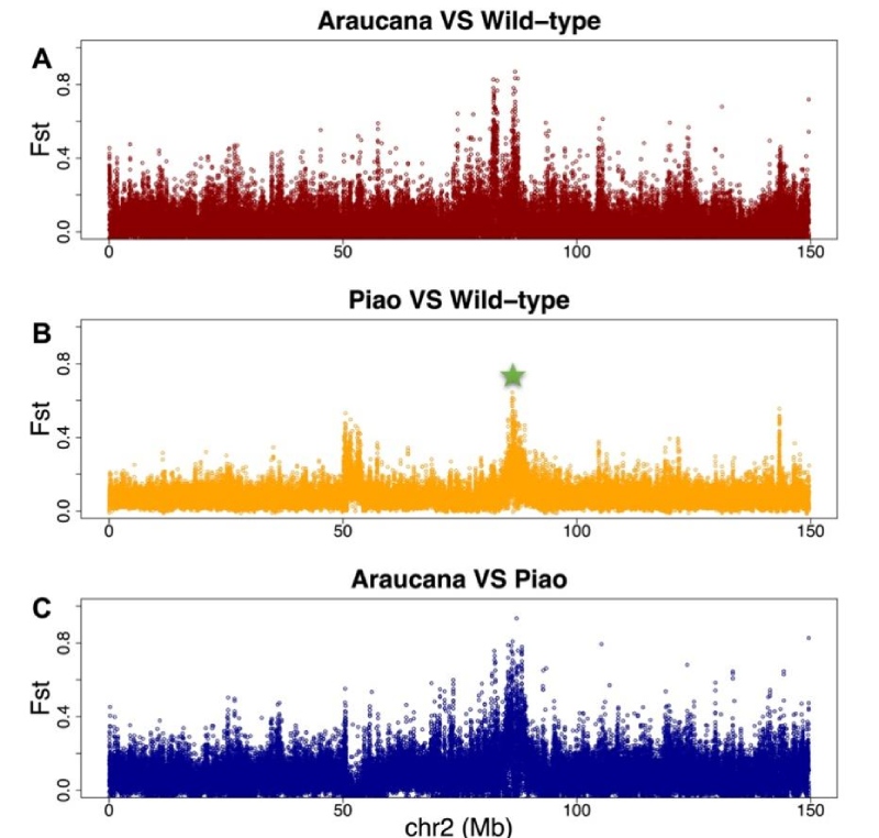 瓢雞無尾表型的定位區(qū)間,與之前報道的美國阿勞卡納雞品種無尾表型區(qū)間非常接近但精細(xì)定位區(qū)間沒有重疊。對瓢雞、阿勞卡納以及其他具有正常尾巴的多個種群的群體基因組分析顯示,雖然這兩個無尾品種在2號染色體的相同區(qū)域受到選擇,但選擇具有品種差異性。在阿勞卡納雞2號染色體上識別的兩個候選SNP在無尾瓢雞中并不存在,并且在瓢雞中證實的致因缺失突變在阿勞卡納雞也不存在。即瓢雞和阿勞卡納雞無尾特征可能源自不同的致病突變。