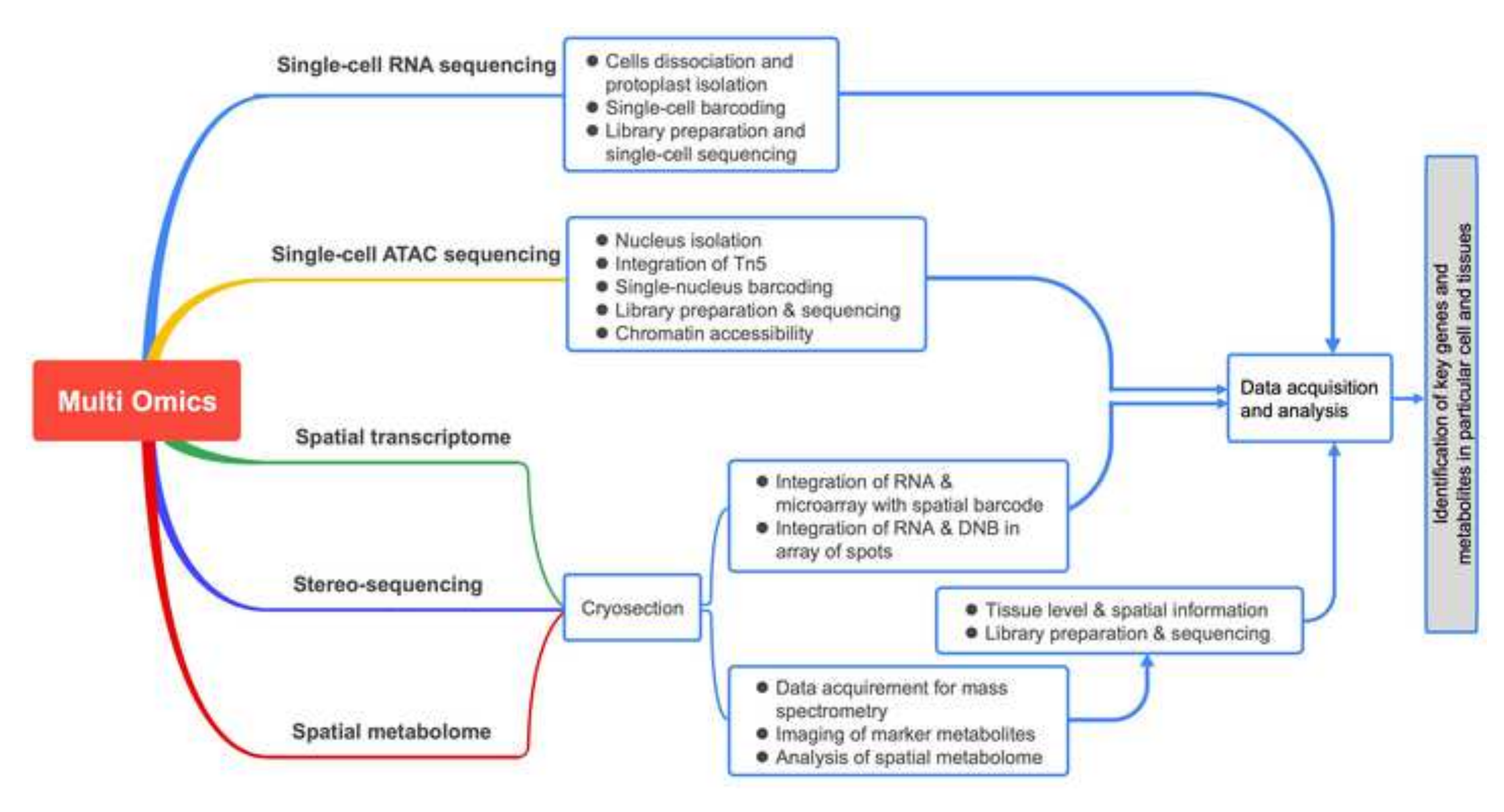 圖1-植物多組學(xué)研究流程圖,單細(xì)胞轉(zhuǎn)錄組測(cè)序、單細(xì)胞ATAC測(cè)序(可轉(zhuǎn)座酶可及染色質(zhì)測(cè)序)、空間轉(zhuǎn)錄組及空間代謝組在獲得特定類群細(xì)胞或組織基因表達(dá)及代謝信息的應(yīng)用。