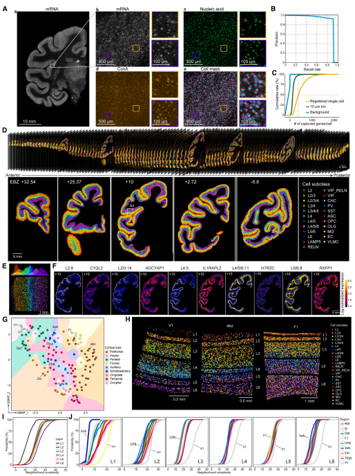 取樣策略:每隔500 μm取一次:包含兩個(gè)50 μm的大腦樣品切片進(jìn)行snRNA-seq+一張10 μm切片進(jìn)行空間轉(zhuǎn)錄組+兩張臨片切片進(jìn)行尼氏染色。獼猴#1 119張切片、獼猴#2 19張切片、獼猴#3 23張切片,共161張進(jìn)行空間轉(zhuǎn)錄組闡明大腦皮層的細(xì)胞組織是理解大腦結(jié)構(gòu)和功能的關(guān)鍵。在本研究中,研究人員利用大規(guī)模單核RNA測(cè)序和143個(gè)獼猴皮質(zhì)區(qū)域的空間轉(zhuǎn)錄組學(xué)分析,獲得了264種轉(zhuǎn)錄組定義的皮質(zhì)細(xì)胞類(lèi)型的綜合圖譜,并繪制了它們?cè)谡麄€(gè)皮質(zhì)的空間分布。表征了谷氨酸能、氨基丁酸能和非神經(jīng)元細(xì)胞類(lèi)型的皮質(zhì)層和區(qū)域偏好,以及細(xì)胞類(lèi)型組成和“鄰域復(fù)雜性”的區(qū)域差異。值得注意的是,研究人員發(fā)現(xiàn)了視覺(jué)和體感系統(tǒng)中各種細(xì)胞類(lèi)型的區(qū)域分布與區(qū)域等級(jí)水平之間的關(guān)系。來(lái)自人類(lèi)、獼猴和小鼠皮層的轉(zhuǎn)錄組學(xué)數(shù)據(jù)的跨物種比較進(jìn)一步揭示了靈長(zhǎng)類(lèi)特異性細(xì)胞類(lèi)型在第4層富集,其標(biāo)記基因以區(qū)域依賴(lài)的方式表達(dá)。該研究數(shù)據(jù)為理解靈長(zhǎng)類(lèi)動(dòng)物大腦的進(jìn)化、發(fā)育、衰老和發(fā)病機(jī)制提供了細(xì)胞和分子基礎(chǔ)。