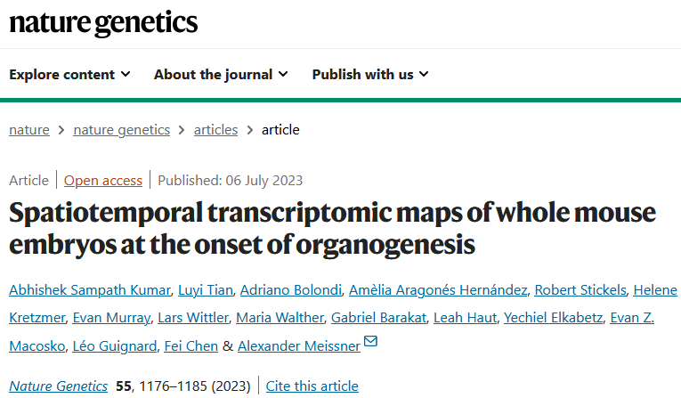 英文標(biāo)題:Spatiotemporal transcriptomic maps of whole mouse embryos at the onset of organogenesis