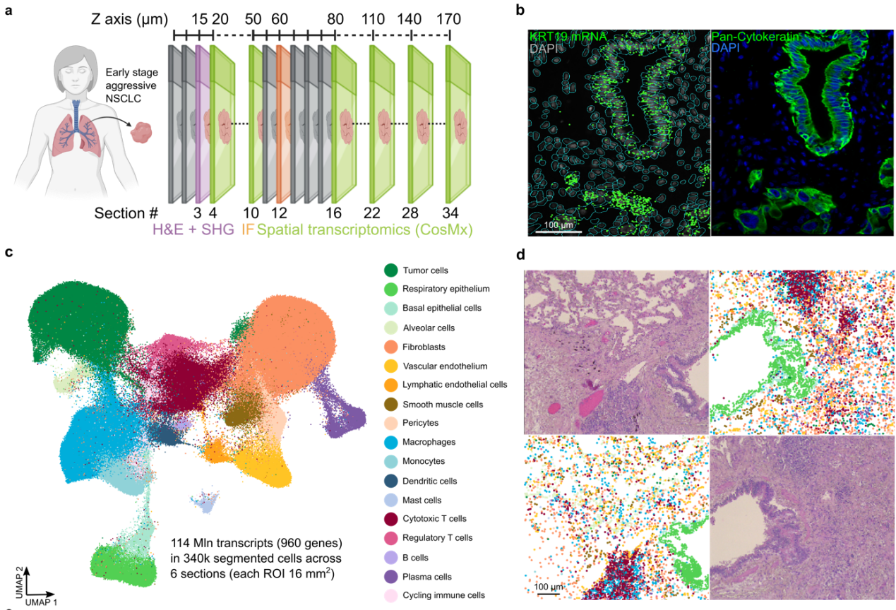 取樣策略:非小細(xì)胞肺癌(NSCLC)腫瘤塊連續(xù)切下34個(gè)5 μm切片:分別進(jìn)行二次諧波SHG成像、H&E染色、空間轉(zhuǎn)錄組(1000 Panel CosMx空間分子成像系統(tǒng))該研究展示了侵襲性人肺癌常規(guī)臨床樣本的3D空間圖譜,通過(guò)將跨340,000個(gè)細(xì)胞的960個(gè)癌癥相關(guān)基因的原位定量與組織力學(xué)成分的測(cè)量相結(jié)合,三維細(xì)胞鄰域?qū)⒛[瘤微環(huán)境細(xì)分為腫瘤、基質(zhì)和免疫多細(xì)胞生態(tài)位。有趣的是,偽時(shí)間分析表明,在基質(zhì)浸潤(rùn)性腫瘤細(xì)胞中檢測(cè)到的促侵襲性上皮細(xì)胞向間充質(zhì)細(xì)胞轉(zhuǎn)化(EMT)已經(jīng)發(fā)生在腫瘤表面的一個(gè)區(qū)域。在那里,肌成纖維細(xì)胞和巨噬細(xì)胞特異性地與侵襲前腫瘤細(xì)胞共定位,它們的多細(xì)胞分子特征確定了生存時(shí)間較短的患者。與2D相比,3D鄰域通過(guò)識(shí)別樹(shù)突狀生態(tài)位,捕捉T細(xì)胞生態(tài)位的3D擴(kuò)展和促進(jìn)生態(tài)位特異性細(xì)胞-細(xì)胞相互作用的量化(包括可藥物免疫檢查點(diǎn)),改善了免疫生態(tài)位的表征。