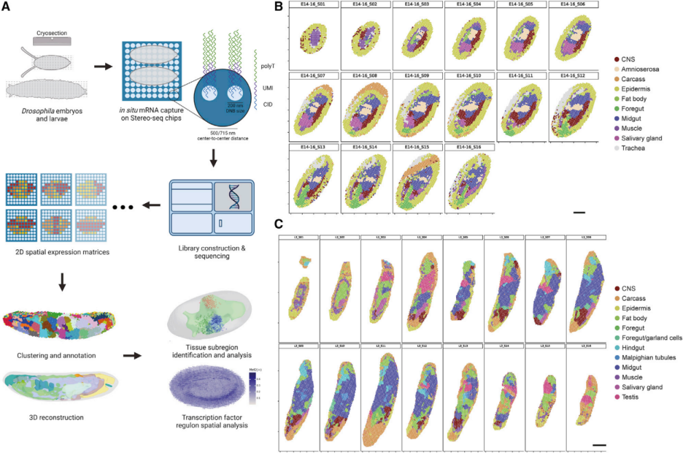 取樣策略:胚胎發(fā)生過(guò)程的24小時(shí)內(nèi),每隔0.5至2小時(shí)收集一次胚胎;3個(gè)幼蟲(chóng)期的每個(gè)早/晚時(shí)間點(diǎn)采集幼蟲(chóng)樣本;蛹化后每隔12 h采集一次蛹樣。共計(jì)43個(gè)胚胎、9個(gè)幼蟲(chóng)、5個(gè)蛹,收集7或8 μm厚度的矢狀面進(jìn)行空間轉(zhuǎn)錄組。