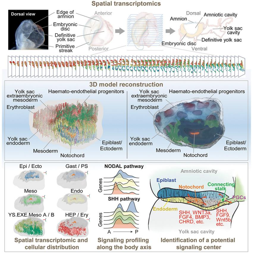 在本研究中,通過(guò)構(gòu)建完整的CS8人類(lèi)胚胎3D模型,將單個(gè)細(xì)胞的空間信息與其基因表達(dá)譜相結(jié)合,系統(tǒng)描繪了胚胎形態(tài)、細(xì)胞類(lèi)群、空間位置和轉(zhuǎn)錄組特征,準(zhǔn)確注釋了不同的細(xì)胞亞型,深度解析了重要胚外組織羊膜細(xì)胞發(fā)育過(guò)程和卵黃囊造血譜系特化,重點(diǎn)發(fā)現(xiàn)了參與早期發(fā)育的不同信號(hào)通路采用不同的策略沿胚胎A-P軸建立差異激活的特點(diǎn)。這項(xiàng)研究不僅可以確定人類(lèi)原腸胚形成過(guò)程的關(guān)鍵細(xì)胞和分子特征,還可以指導(dǎo)今后干細(xì)胞衍生的人類(lèi)胚胎模型的生成。