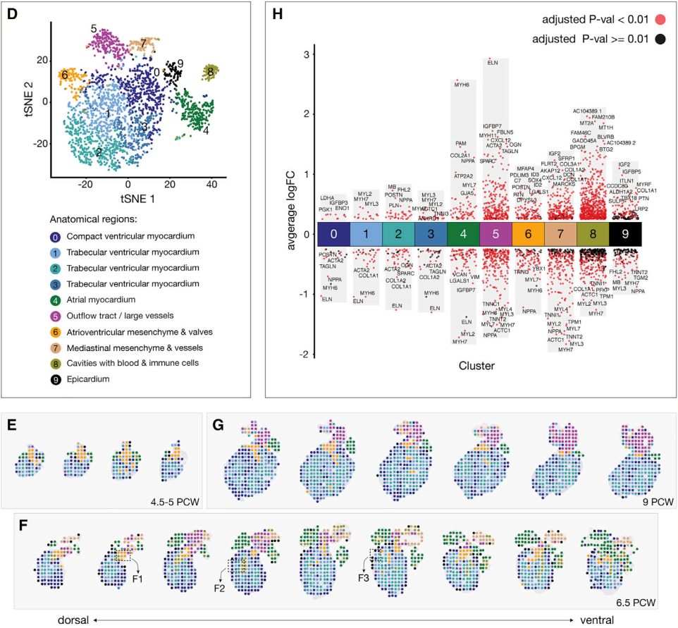 取樣策略:4.5-5 PCW 4張切片,6.5 PCW 9張切片,9 PCW 6張切片,合計(jì)19張切片文章構(gòu)建了單細(xì)胞時(shí)空水平的發(fā)育中器官的3D轉(zhuǎn)錄圖譜,這種多轉(zhuǎn)錄組測(cè)序方法可以應(yīng)用于其他器官發(fā)育的研究中。這一突破性研究使探索組織的整體空間轉(zhuǎn)錄模式成為可能,探索細(xì)胞異質(zhì)性,并選擇性地靶向一些表達(dá)模式具有空間異質(zhì)性且造成細(xì)胞類(lèi)型差異的關(guān)鍵基因。心臟發(fā)育模型表明,空間、時(shí)間信息與單細(xì)胞基因表達(dá)數(shù)據(jù)的整合對(duì)于識(shí)別細(xì)胞類(lèi)型之間的關(guān)鍵差異、深入分析發(fā)育中的組織是至關(guān)重要的。
