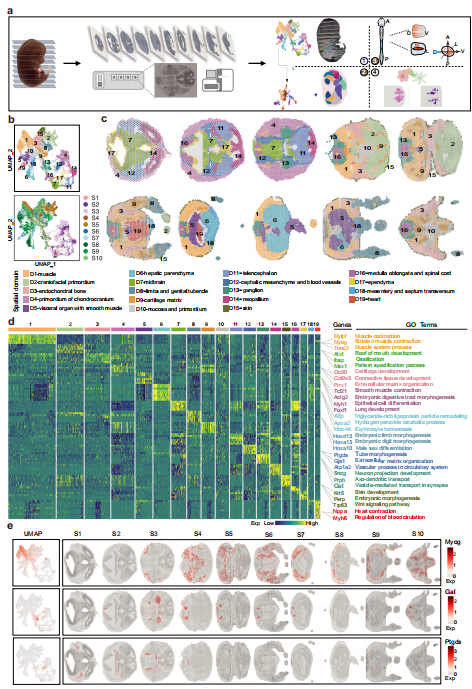 取樣策略:E13.5小鼠胚胎沿顱尾軸連續(xù)冷凍切片,從中選10張10 μm切片進(jìn)行10x Visium空間轉(zhuǎn)錄組;雌性胚胎(E3)獲得了4個(gè)切片,以更好地覆蓋性別分化在本研究中,研究人員展示了小鼠胚胎第13.5天所有主要器官的空間轉(zhuǎn)錄組圖譜,并通過(guò)堆疊切片提供了胚胎模式分子調(diào)控的三維渲染。通過(guò)將空間圖譜與相應(yīng)的單細(xì)胞轉(zhuǎn)錄組學(xué)數(shù)據(jù)相結(jié)合,提供了一個(gè)詳細(xì)的關(guān)于器官發(fā)育動(dòng)態(tài)本質(zhì)的分子注釋?zhuān)臻g細(xì)胞相互作用,胚胎軸,以及哺乳動(dòng)物發(fā)育背后的細(xì)胞命運(yùn)分化,這將為精確的器官工程和基于干細(xì)胞的再生醫(yī)學(xué)鋪平道路。