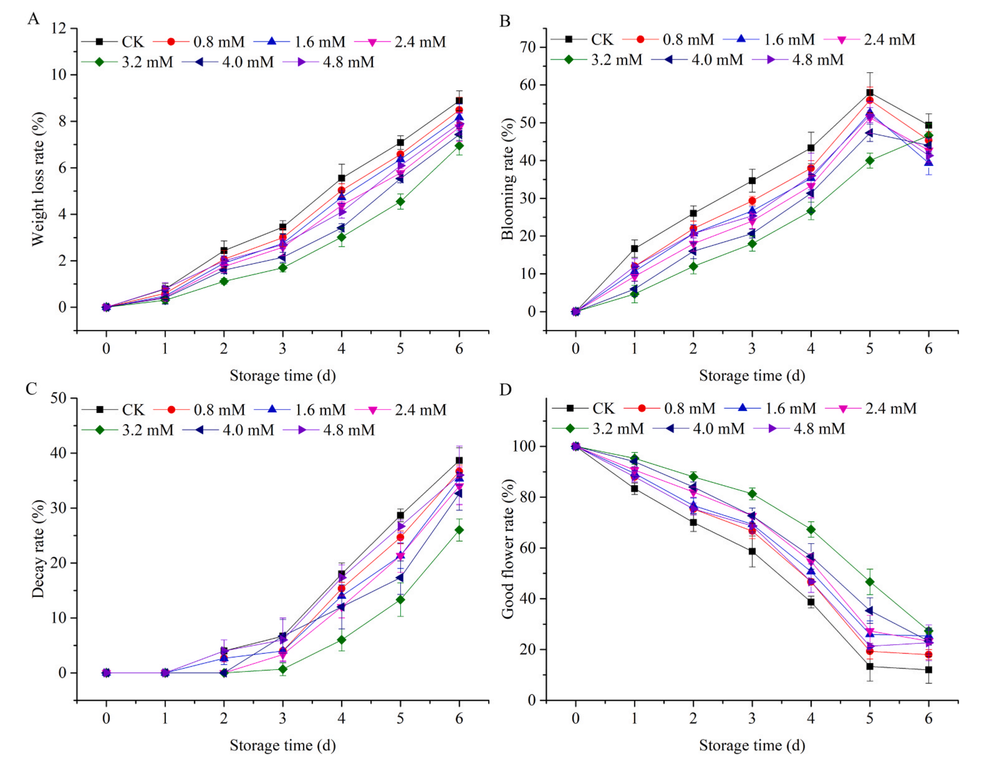 黃花菜在貯藏過(guò)程中,由于呼吸和蒸騰作用,水分和營(yíng)養(yǎng)物質(zhì)不斷被消耗。結(jié)果表明,隨著貯藏時(shí)間的延長(zhǎng),CK組表現(xiàn)為嚴(yán)重失重,H2S處理緩解了黃花菜的失重,尤其是3.2 mM NaHS緩解效果最大。H2S處理能不同程度地延遲了黃花菜的開(kāi)花,并能能較好地維持黃花菜的品質(zhì)。