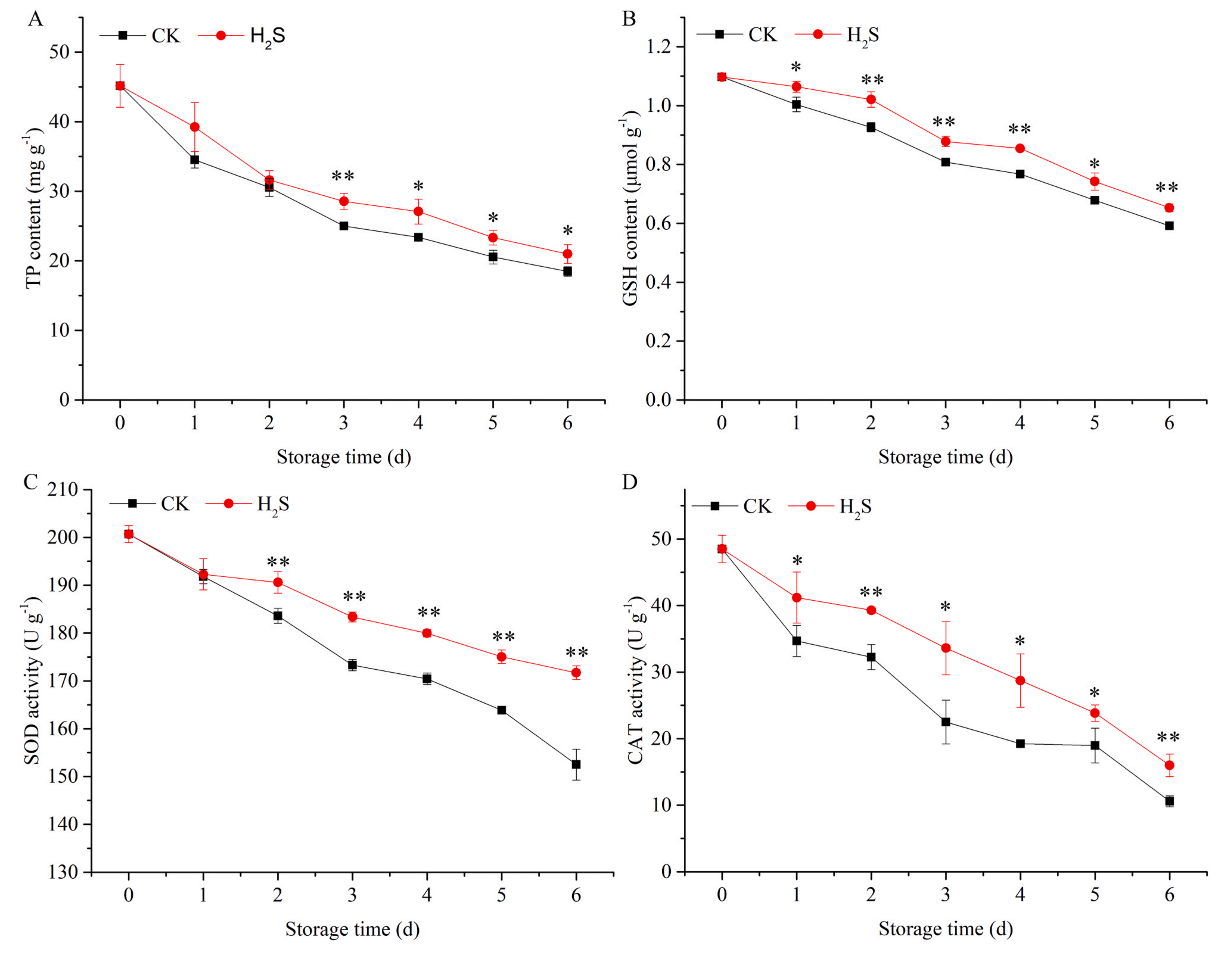 在CK和H2S處理組中,TP含量均隨貯藏時(shí)間的延長(zhǎng)而下降。H2S處理減緩了TP含量的下降,且從第3 d開(kāi)始出現(xiàn)顯著差異,說(shuō)明H2S起到了阻斷蛋白的作用。H2S還改變了黃花菜的抗氧化系統(tǒng)。在整個(gè)貯藏期內(nèi),H2S處理組采后黃花菜GSH含量顯著高于CK組。黃花菜SOD活性呈下降趨勢(shì),而H2S在第2 d開(kāi)始顯著緩解了這種下降趨勢(shì),維持在高于CK組的水平。CAT活動(dòng)結(jié)果表明,H2S處理組CAT活性活性顯著高于對(duì)照。