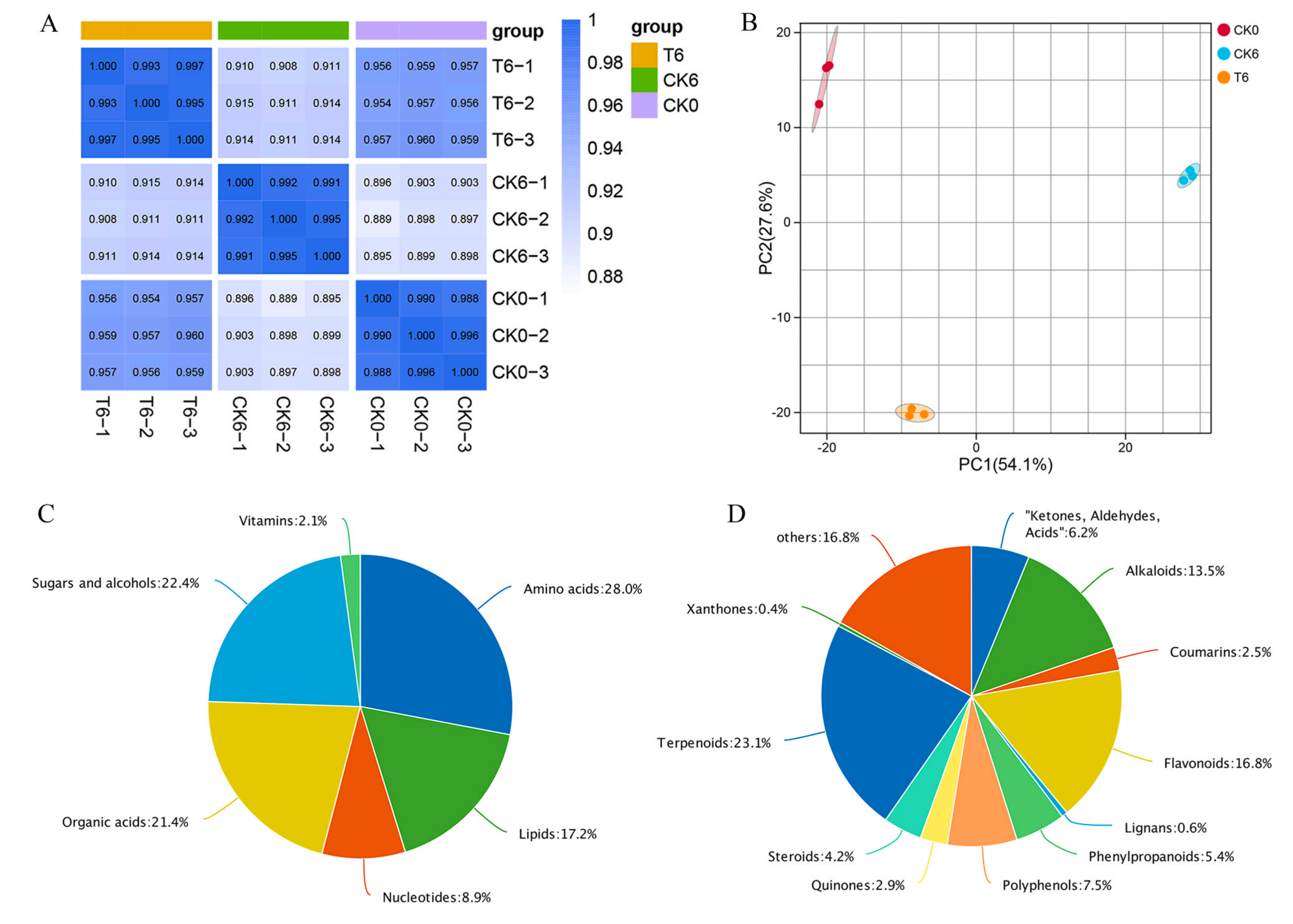 為了進(jìn)一步研究H2S對(duì)黃花菜貯藏過(guò)程中品質(zhì)的調(diào)控機(jī)制,利用植物廣靶代謝組學(xué)方法分析了NaHS處理后黃花菜代謝產(chǎn)物的變化。共鑒定了910種代謝物,包括429種初級(jí)代謝物和481種次生代謝物,分別為氨基酸、糖和醇、有機(jī)酸、脂質(zhì)、核苷酸、維生素、萜類(lèi)、黃酮類(lèi)、生物堿、多酚、“酮類(lèi)、醛類(lèi)、酸類(lèi)”、苯丙素、類(lèi)固醇、醌類(lèi)、香豆素、木脂素和山酮。PCA分析顯示,CK0, CK6和T6三組在代謝水平上存在差異。
