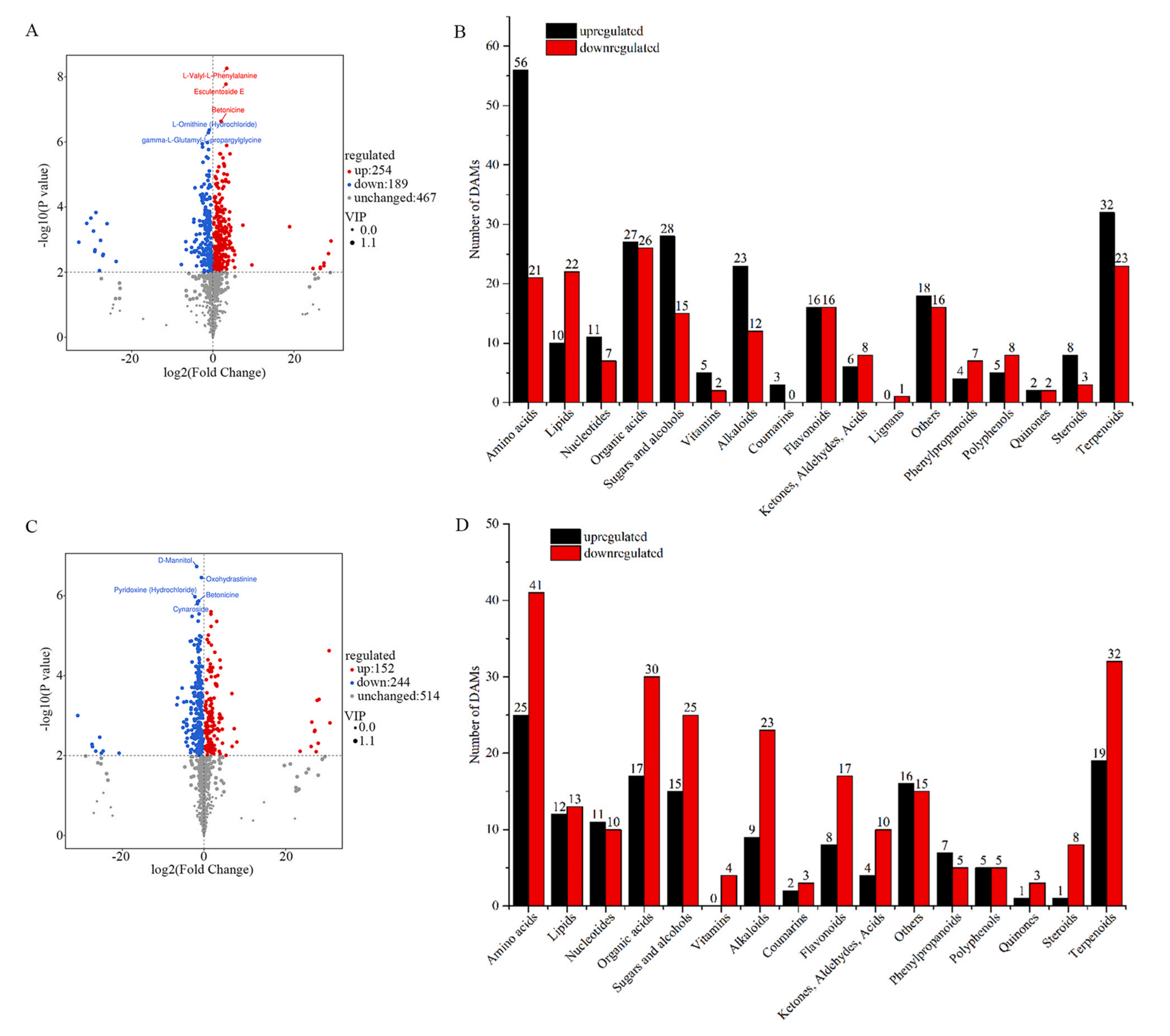 根據(jù)FC > 1、P < 0.05和VIP > 1的篩選標(biāo)準(zhǔn),在CK0和CK6之間共鑒定出443個(gè)DAMs。其中,254種代謝物在CK0中上調(diào),189種代謝物下調(diào)。這些DAMs代表了衰老黃花菜的主要成分變化,可分為17類(lèi),包括230種初級(jí)代謝物和213種次級(jí)代謝物。包括56種氨基酸、10種脂類(lèi)、11種核苷酸、27種有機(jī)酸、28種糖和醇類(lèi)、5種維生素、23種生物堿、3種香豆素、16種黃酮類(lèi)、6種酮類(lèi)、醛類(lèi)、酸類(lèi)、4種苯丙素、5種多酚類(lèi)、2種醌類(lèi)、8種類(lèi)固醇、32種萜類(lèi)和18個(gè)其他類(lèi)。對(duì)于下調(diào)代謝物,鑒定了93種氨基酸(21種)、脂質(zhì)(22種)、核苷酸(7種)、有機(jī)酸(26種)、糖和醇(15種)、維生素(2種)的初級(jí)代謝物,以及96種生物堿(12種)、類(lèi)黃酮(16種)、酮類(lèi)、醛類(lèi)、酸類(lèi)(8種)、木脂素(1種)、苯丙素(7種)、多酚類(lèi)(8種)、醌類(lèi)(2種)、類(lèi)固醇(3種)、萜類(lèi)(23種)和其他(16種)的次級(jí)代謝物。KEGG富集分析表明,DAMs與氨基?;? tRNA生物合成、乙醛酸鹽和二羧酸鹽代謝、精氨酸生物合成、D -氨基酸代謝、丙氨酸、天冬氨酸和谷氨酸代謝密切相關(guān)。