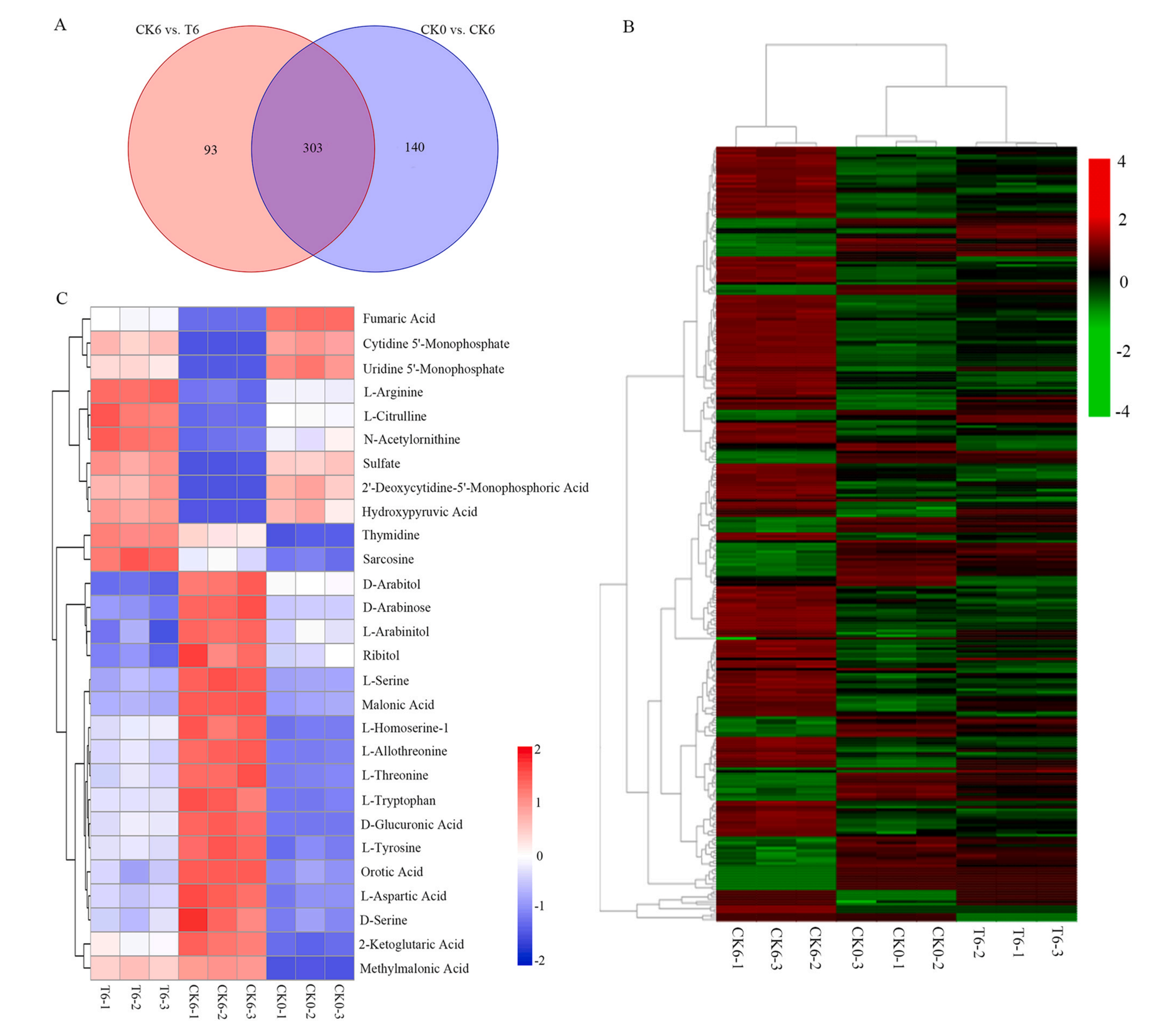 CK6和T6積累的差異代謝物表明H2S處理具有顯著影響。在396個(gè)顯著改變的DAMs中,152個(gè)上調(diào),244個(gè)下調(diào)。氨基酸(66),有機(jī)酸(47),糖和醇(40),脂質(zhì)(25),核苷酸(21)和維生素(4),萜類(lèi)(51),生物堿(32),類(lèi)黃酮(25),酮類(lèi),醛類(lèi),酸類(lèi)(14),苯丙素(12),多酚(10),類(lèi)固醇(9),香豆素(5),醌類(lèi)(4),其他類(lèi)(31)。這些DAMs主要與甘油磷脂代謝、嘧啶代謝、戊糖、甘氨酸、絲氨酸和蘇氨酸代謝有關(guān)。