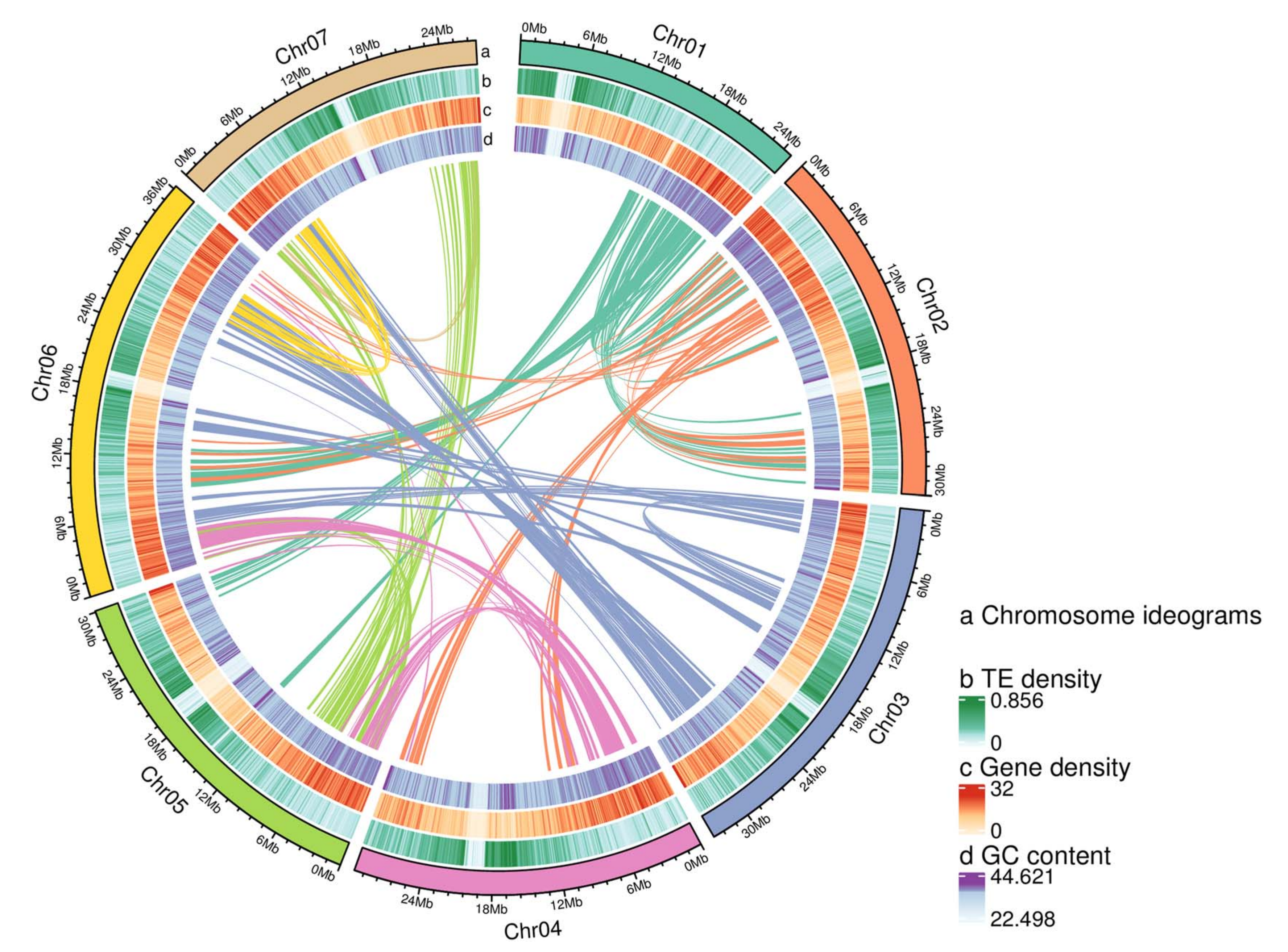 利用這些有效的互作讀對對初步的基因組草圖進行校正,得到了總共221.95 Mb的最終草圖,包含138個contigs (N50 = 16.13 Mb)。這些contigs進一步聚集成131個支架(N50 = 30.0 Mb)。70個支架共219.02 Mb,占總組裝序列的98.68%,占估計基因組大小的99.33%,錨定在7條假染色體上。其中,20個支架(211.23 Mb)的位置和方向被確定,占錨定序列的96.44%。通過blast of essential genes (CEG)數(shù)據(jù)庫和BUSCO數(shù)據(jù)庫來估計該草圖基因組的組裝完整性,共鑒定出458個CEG的456個同源物(99.56%)和1614個BUSCO的1590個同源物(98.51%)。這些結果表明,組裝的空心藨基因組草圖具有較高的完整性。綜合各組組或支架的組裝完整性、無間隙度、N50等指標,該研究組裝的草圖基因組超過了其他覆盆子物種。